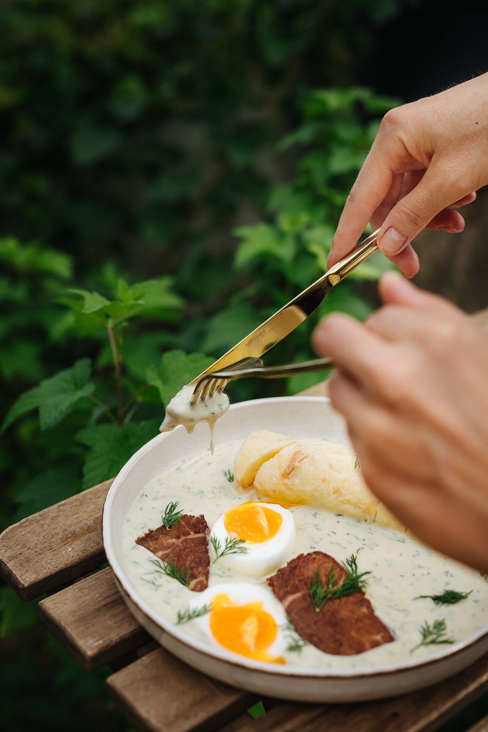 Koprová omáčka s hovězím masem, vejcem a bramborovým knedlíkem s houskou
