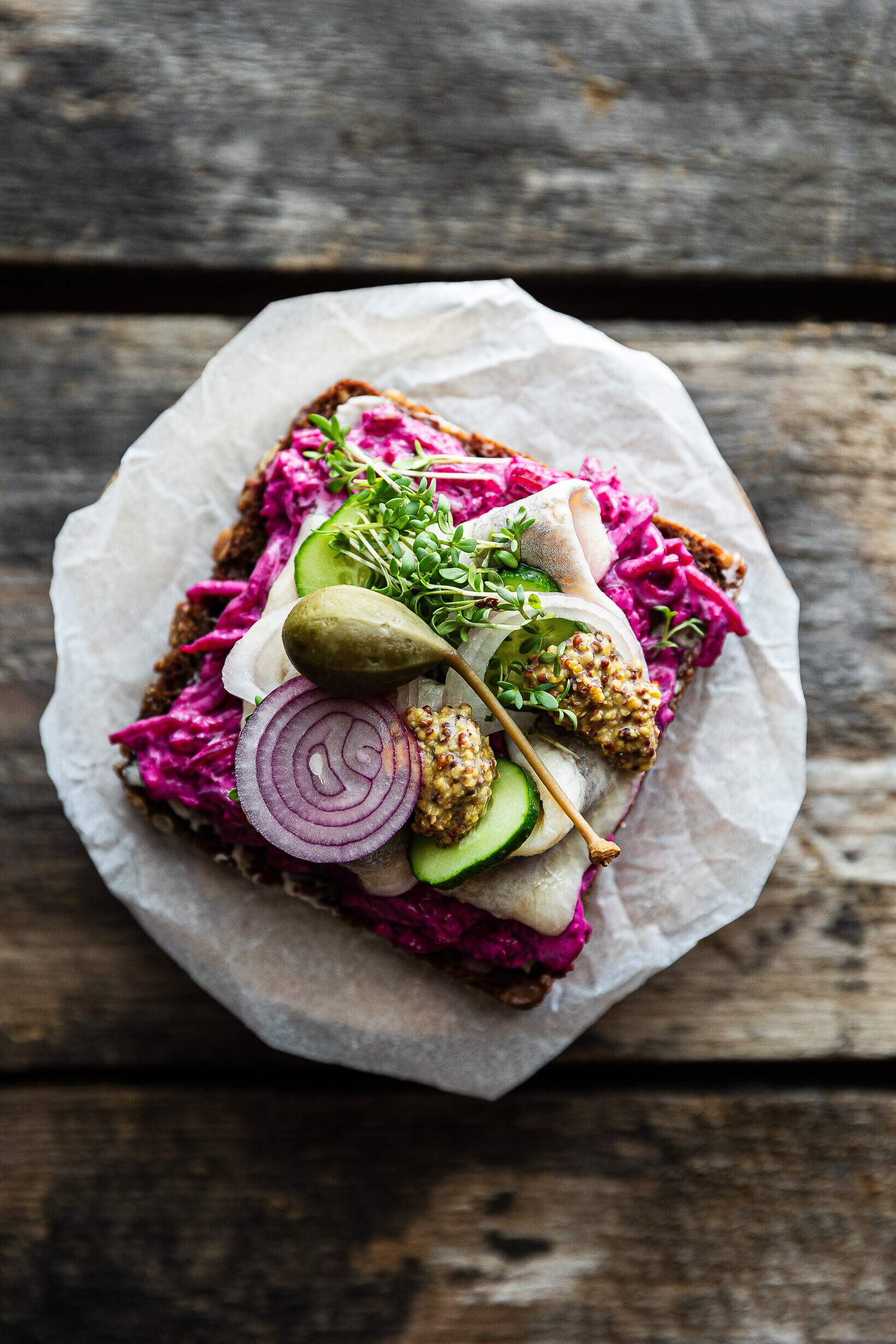 - Smørrebrød se sleděm: Po celé ploše chleba naneste vidličkou kupovanou či domácí řepovou pomazánku nebo nakládanou řepu nakrájenou na nudličky.