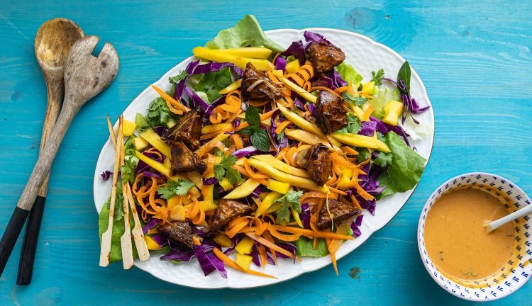 Krevety, kuře & tofu: Pokud máte krevety syrové, na 20 minut je naložte do části dresinku a poté je ogrilujte nebo na troše oleje osmažte. Z bílkovin se hodí i kuře (tomu marinování taktéž prospěje) a marinované tofu nebo tempeh.
