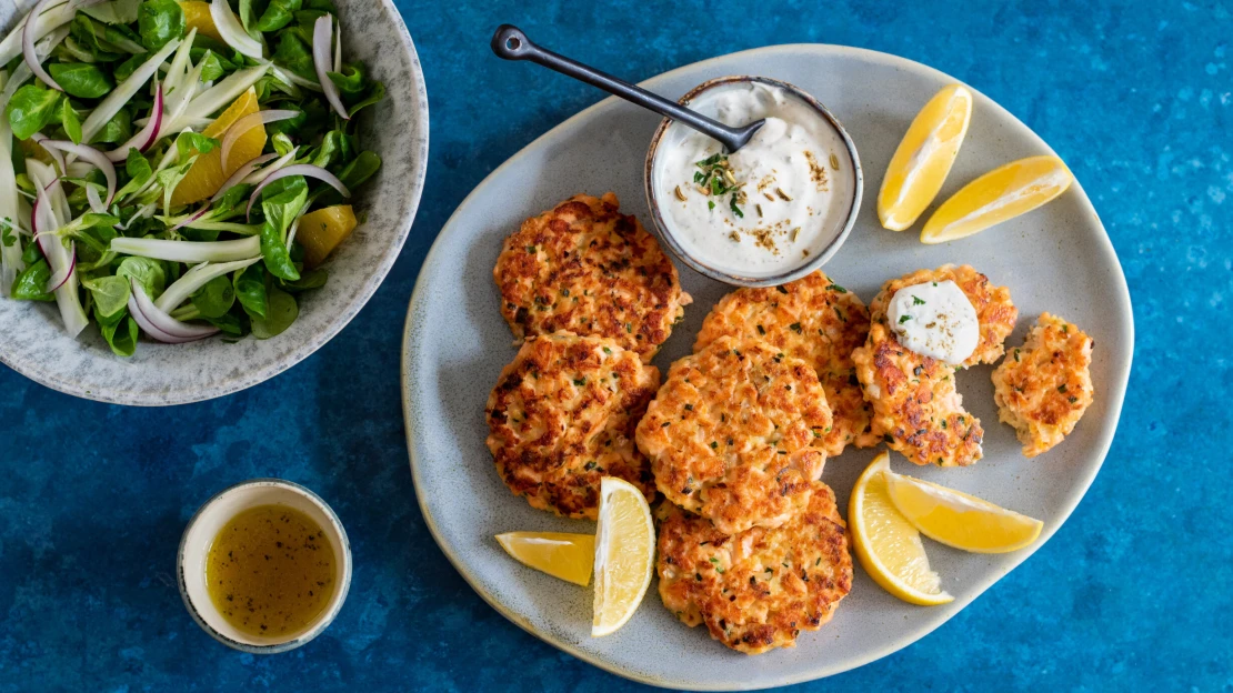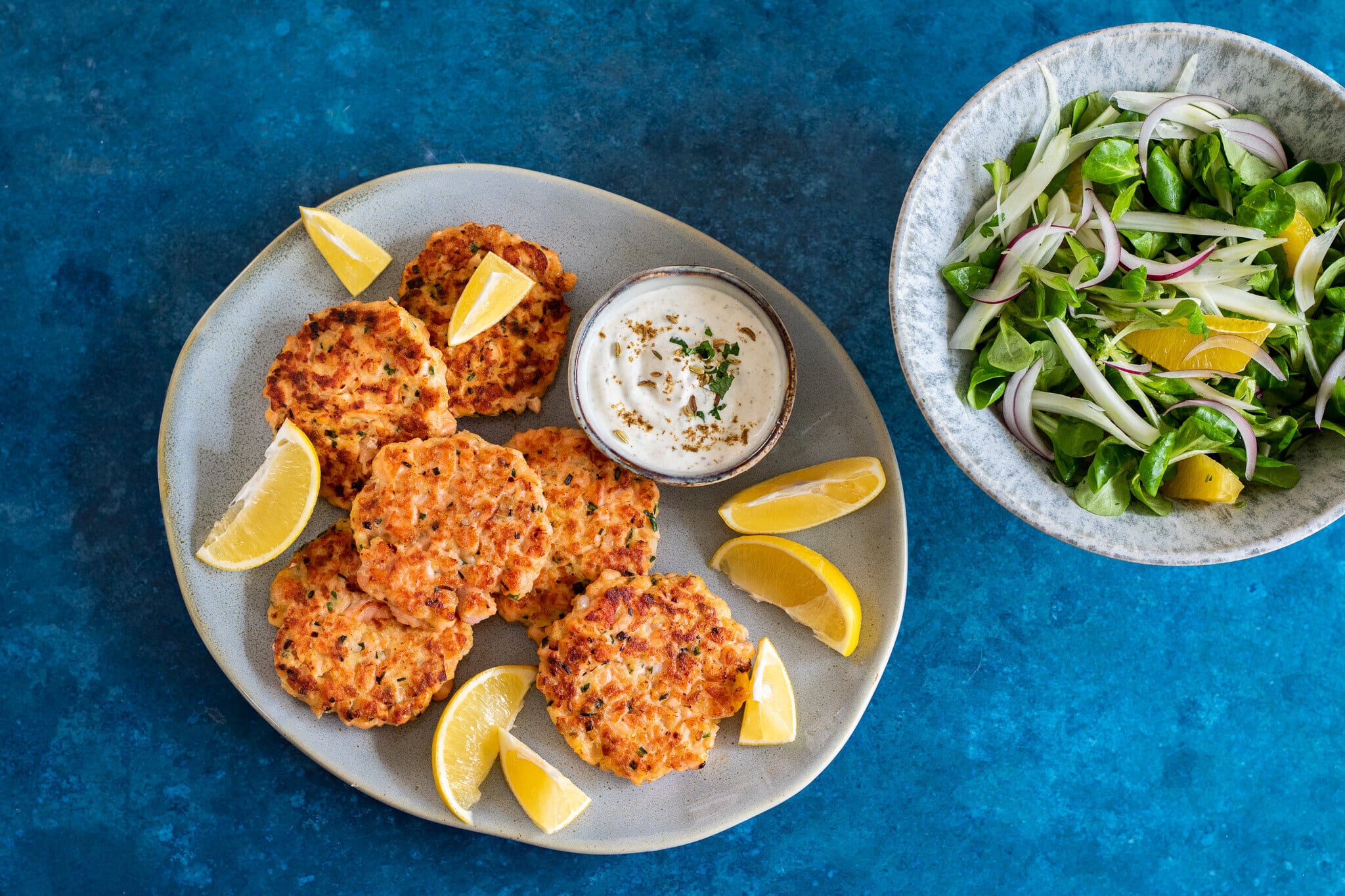Lososové karbanátky s fenyklovo-mátovým dipem a salát s fenyklem a pomeranči