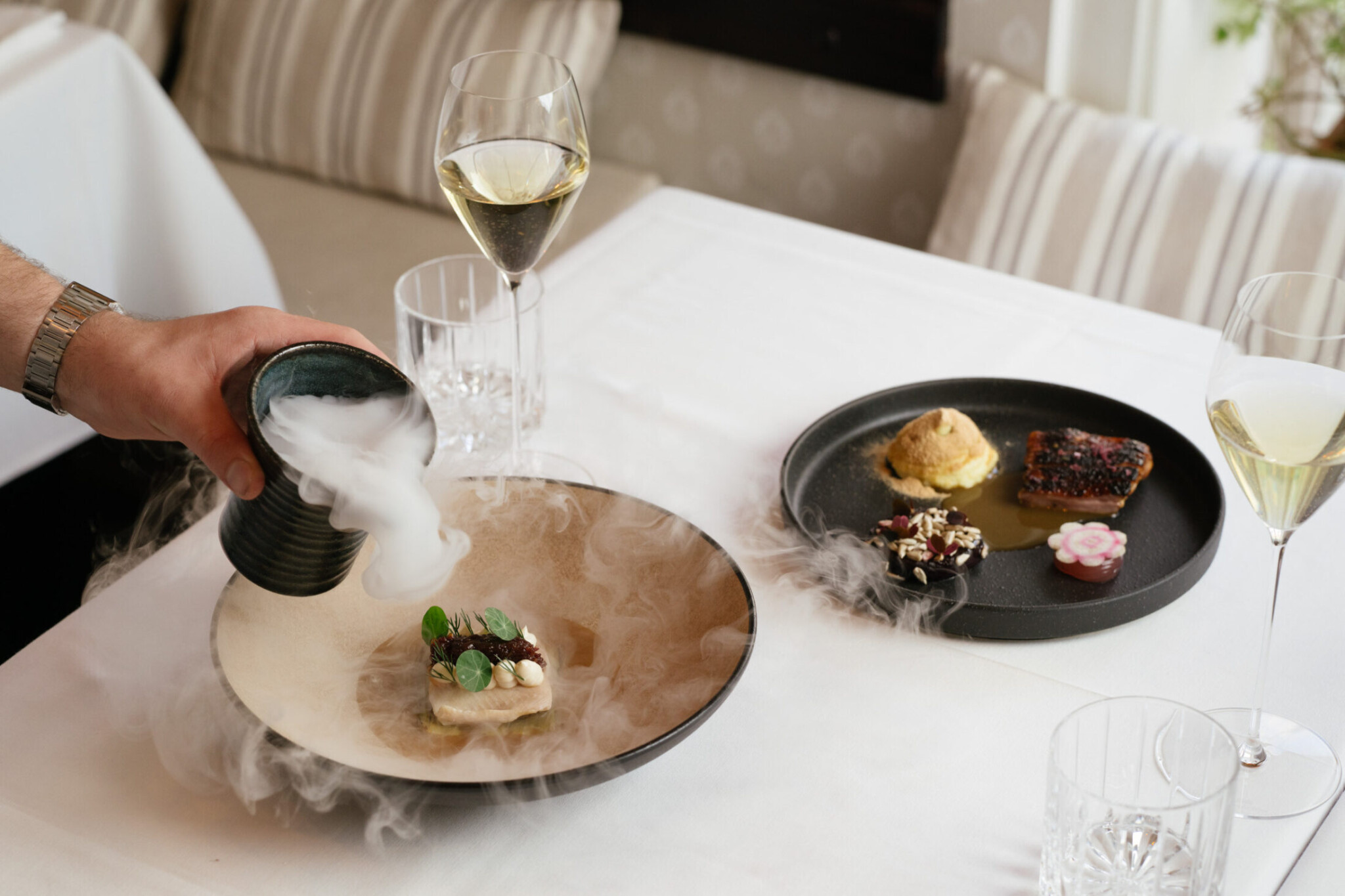 Z předkrmů je fantastický pstruh pošírovaný v másle s pečeným pórkem, který dodá sladkost, výraznou chuť zase uzený špek a paprikášové chutney. Pokud vás láká spíš vegetariánská varianta, pak je to krásně krémová červená pšenice s hrachovým tamari, ovčím sýrem, houbami a lanýži, boží plné jídlo. Následovat může šťavnatá kachna opečená v soli a cukru, což vytváří zdánlivě spálenou krustu.
