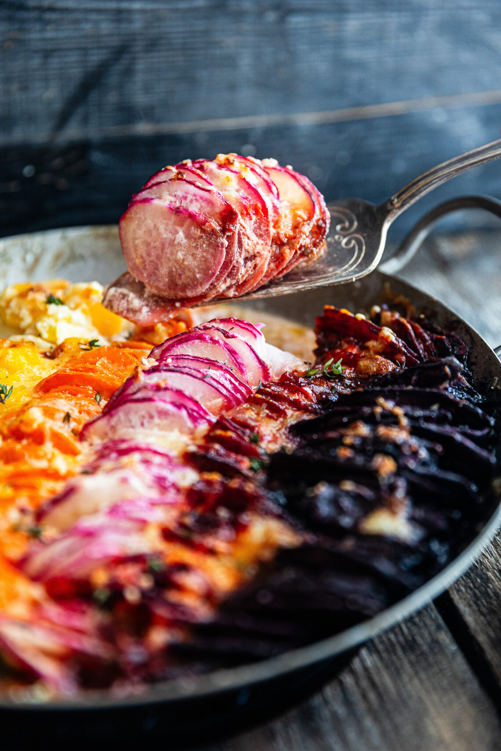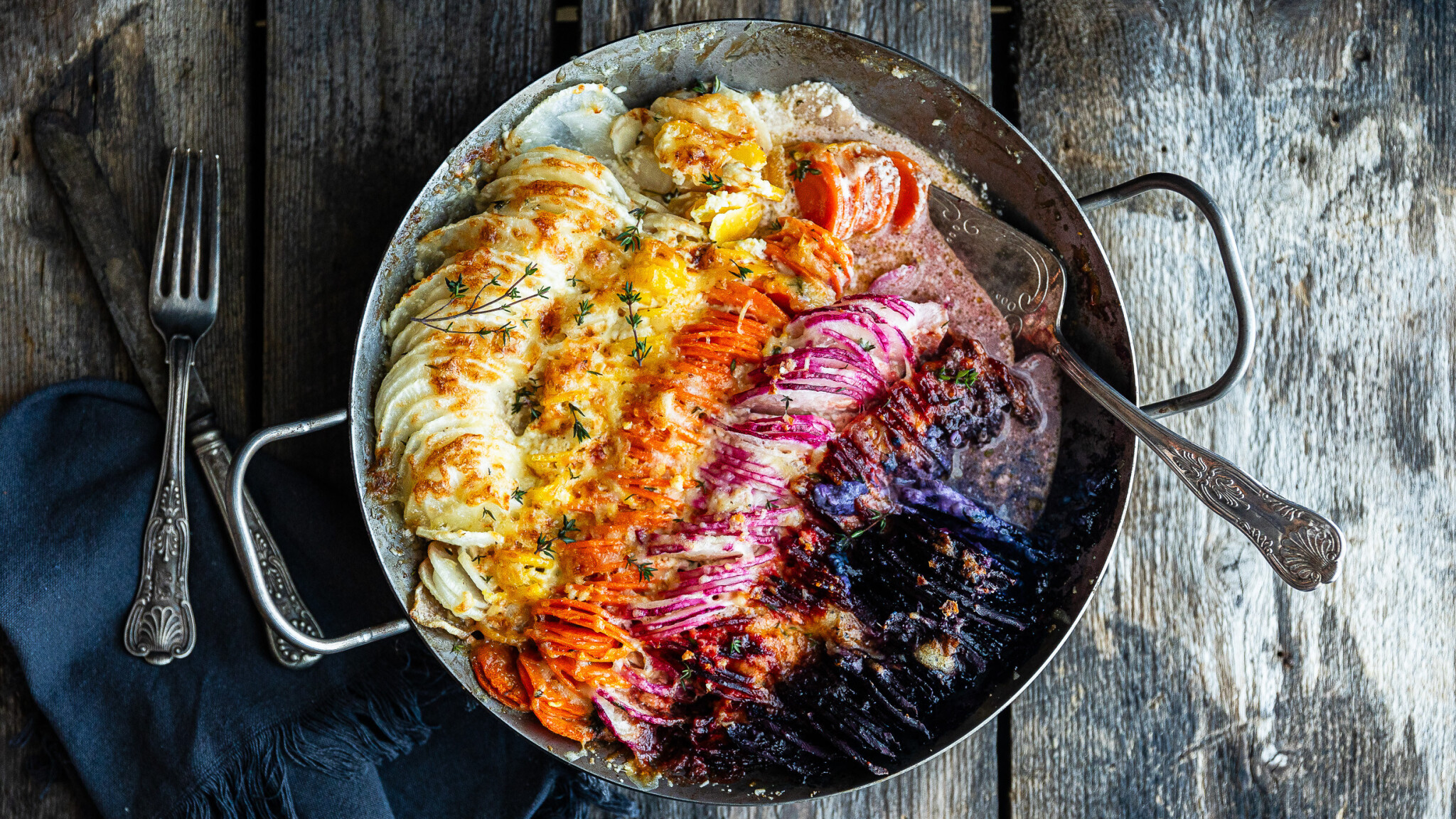 Gratin z kořenové zeleniny zláká téměř všechny vaše smysly. Zelenina zaujme už svým pestrobarevným vzhledem, váš čich posléze začne příjemně dráždit vůně linoucí se z trouby a chuťové buňky po ochutnání výsledku dočista zajásají. Parmazán i oříšková chuť sýru Gruyère si s kořenovou zeleninou krásně rozumí.