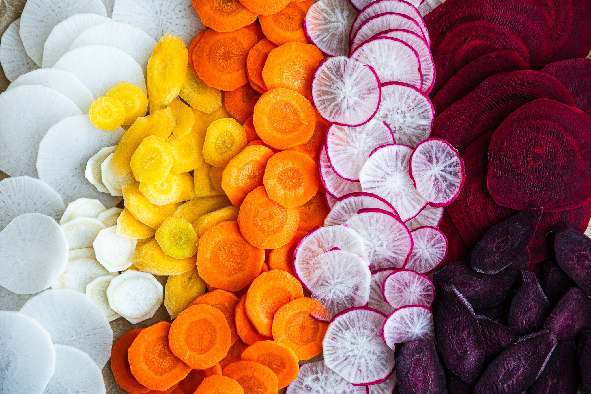 - Zeleninu očistěte a nejlépe na mandolíně nakrájejte na stejně silná kolečka. Zeleninu s menším průměrem (např. petržel nebo žlutou mrkev) můžete nakrájet podélně, aby byla jejich plocha větší.