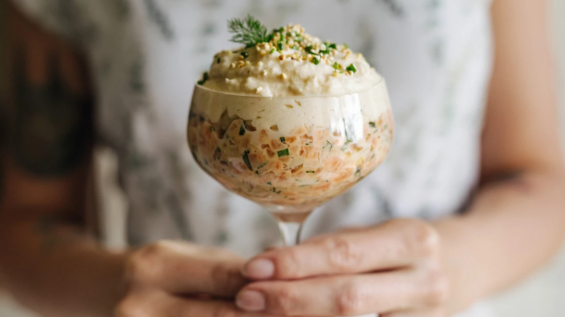 Vychlazený rybí tartar v kontrastu s teplou křenovou omáčkou a křupavými jáhly poslouží jako efektní předkrm na vaši garden party i jako lehký hlavní chod na večeři ve dvou.
