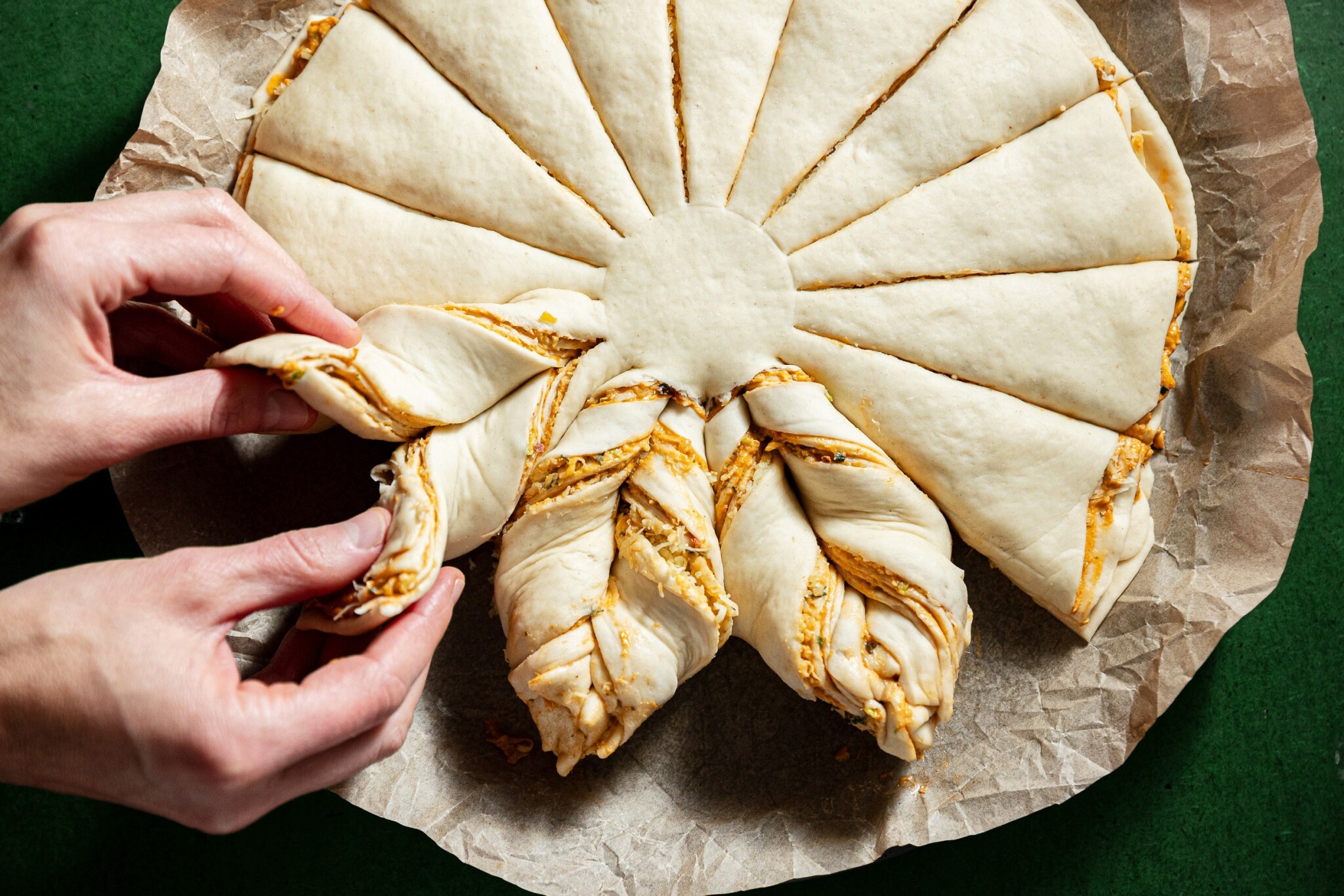 - Chytněte dva naříznuté pruhy těsta vedle sebe, každý do jedné ruky. Dva až třikrát je zatočte – začněte otáčet rukama proti sobě a pokračujte takto dokola (vizte foto výše).