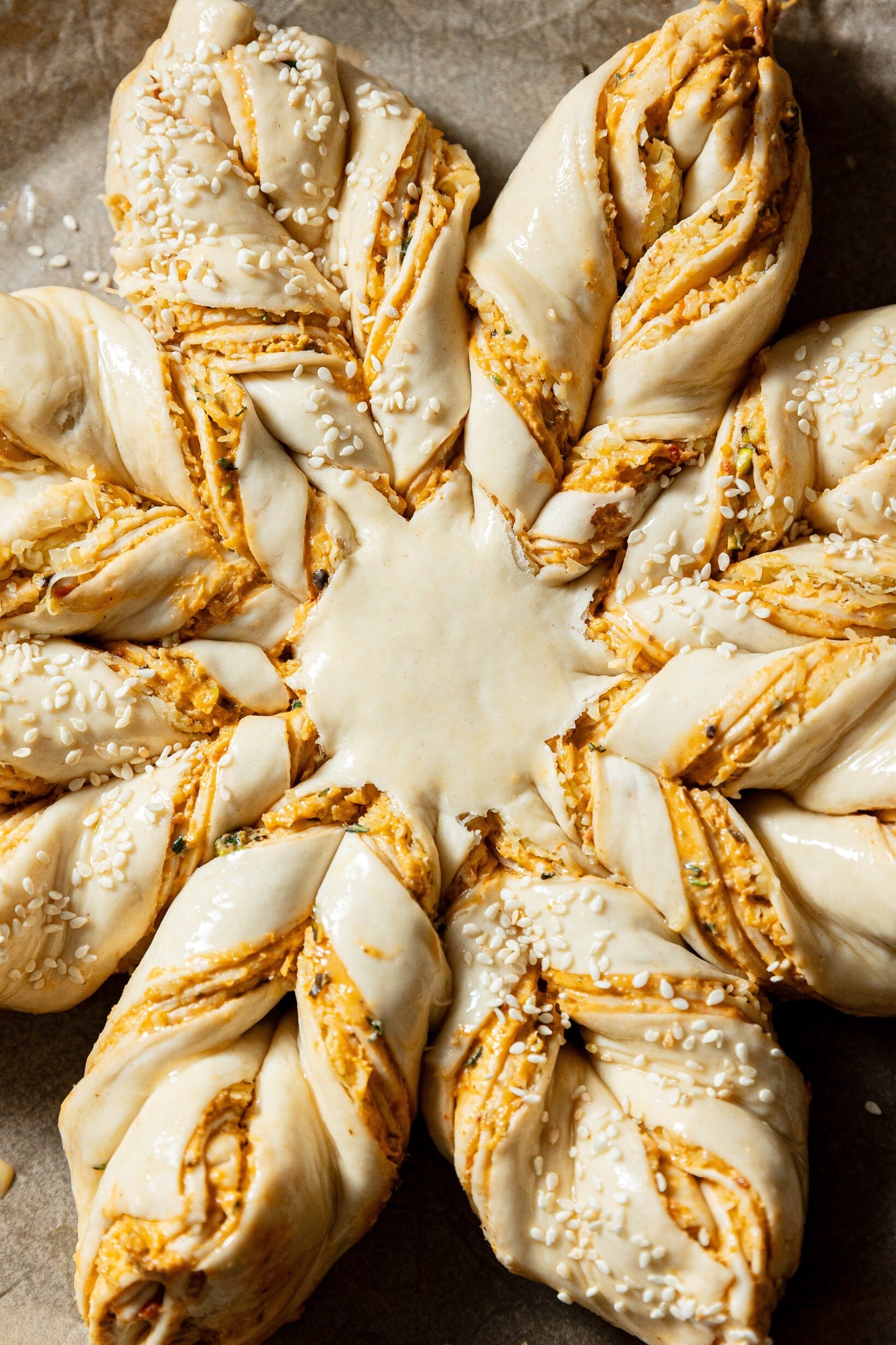 - Konce těsta poté spojte k sobě tak, aby vznikl cíp hvězdy. Opakujte se zbývajícími pruhy, dokud nevytvoříte osmicípou hvězdu.