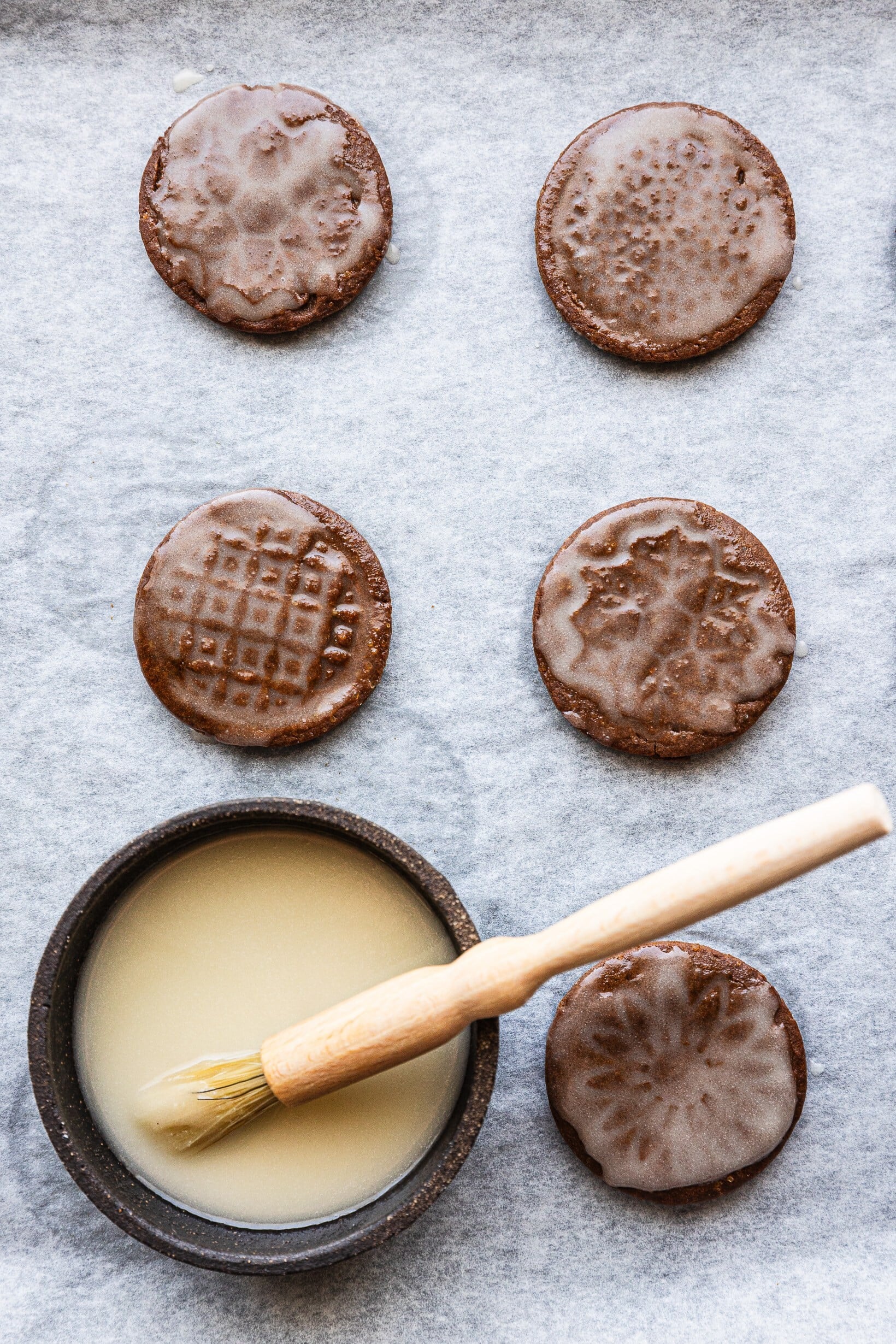 - Perníčky po vyndání z trouby nechte pár minut zchladnout, avšak ještě zatepla je potřete pomocí štětce silnější vrstvou připravené glazury. Poleva se do vytlačeného vzoru pěkně vstřebá.