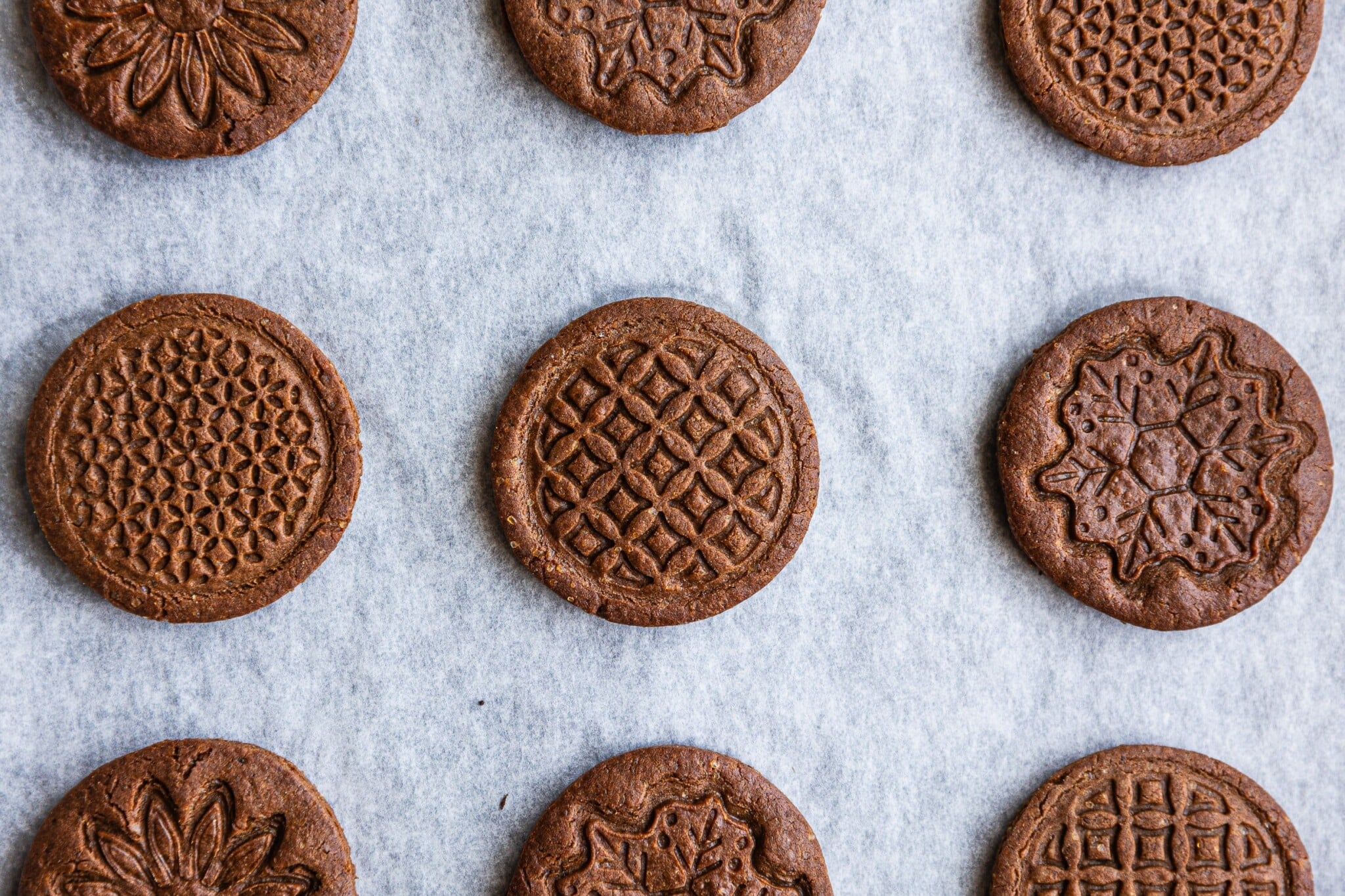 - Vychlazené těsto rozválejte na plát silný 6 až 8 mm. Pokud chcete mít sušenky se vzorem, použijte razítka nebo embosovaný váleček, před použitím je můžete lehce oprášit v mouce a poté je silně vmáčkněte do těsta. Otisk by měl být skutečně viditelný, aby se během pečení nevytratil.