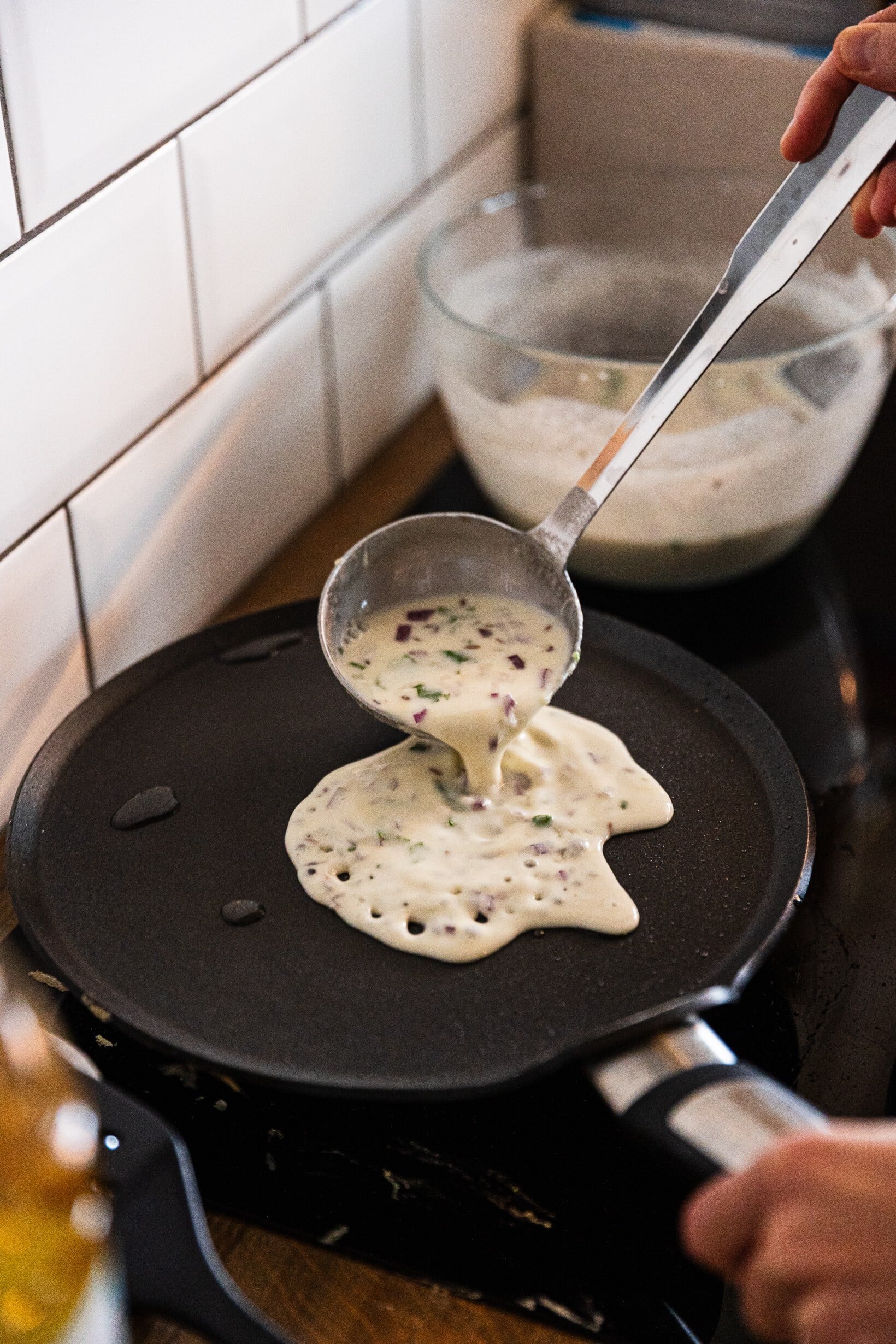 - Okraje placky i prostředek pokapejte pomocí lžičky trochou oleje – to zabraňuje přilepení těsta, podporuje tvorbu typických bublinek a zajistí teplo i horní části placky, která se jinak nesmaží.