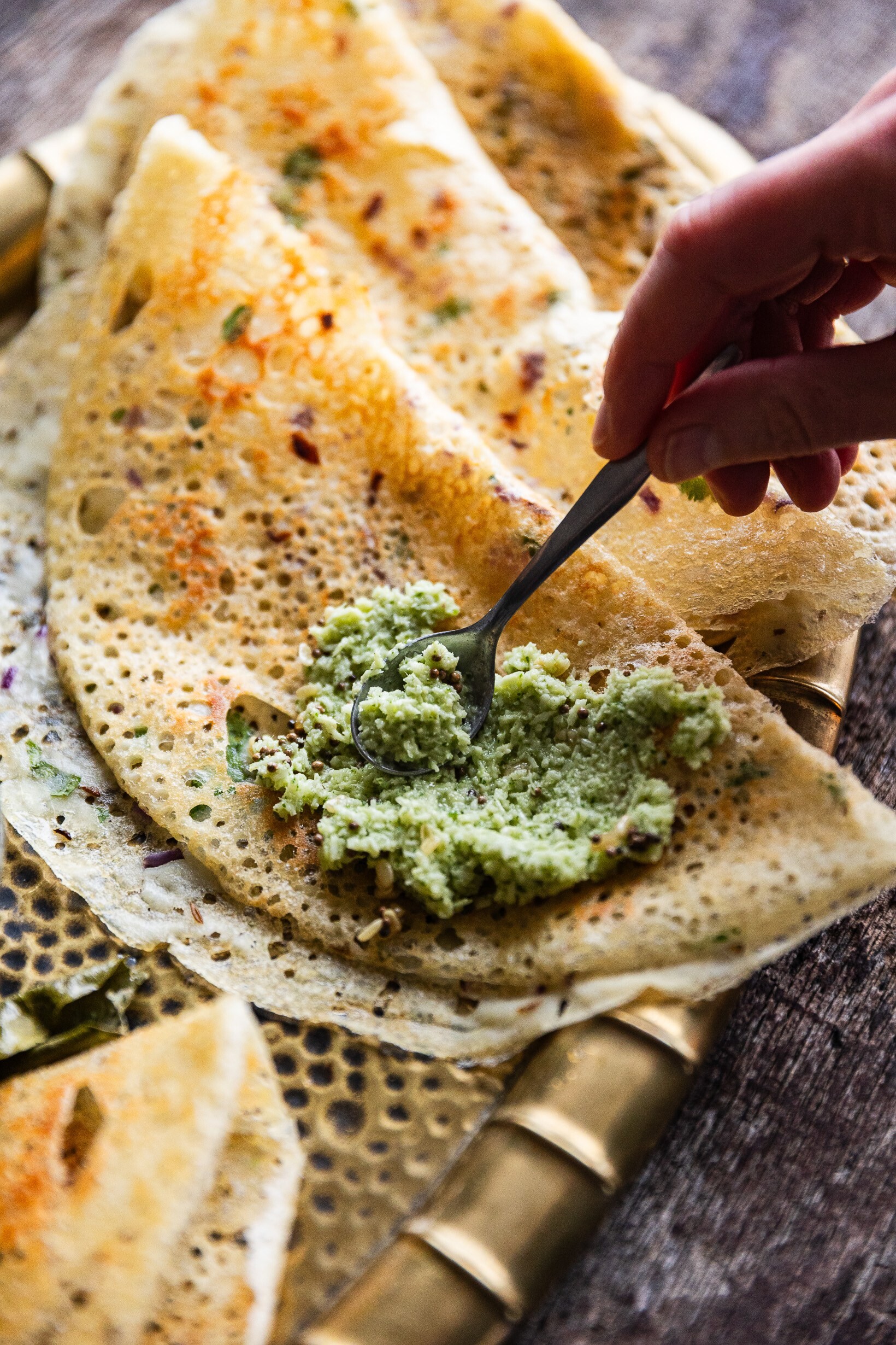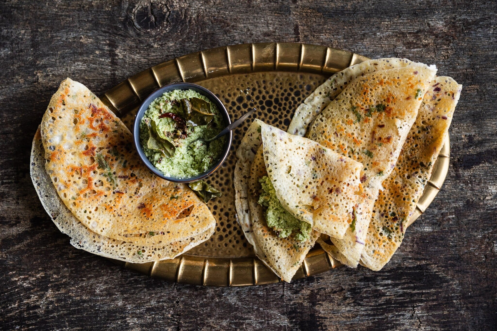Stačí jednoduše smíchat suroviny, těsto nechat chvilku odpočinout a pak jej proměnit v dokonale křupavé placky se slušivým krajkovým vzorem. Křehké palačinky ze semoliny úžasně doplní jemné kokosové čatní s lehce pikantním nádechem po zázvoru a chilli – hodí se k sobě dokonale.