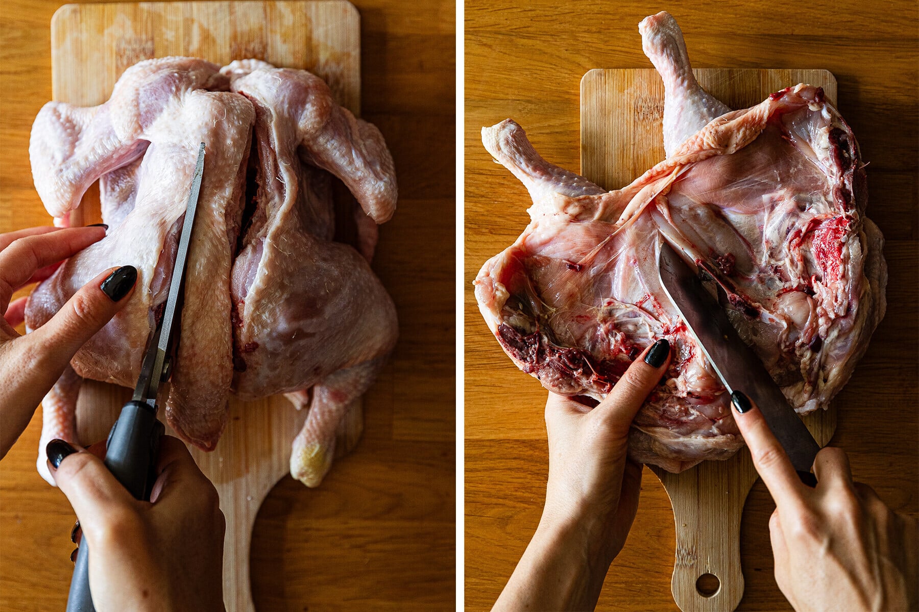 - Kuře otočte prsíčky dolů a nůžkami nebo velmi ostrým nožem odstraňte páteř a biskupa. Odstraňte také poslední díl křidélek, má tendenci se připalovat. Klouby stehen můžete vykloubit, aby šlo kuře více do placata. Pak ho otočte, nožem nařízněte jeho střed jako na fotce, znovu otočte a přitiskněte k podložce, aby se co nejvíce rozpláclo.