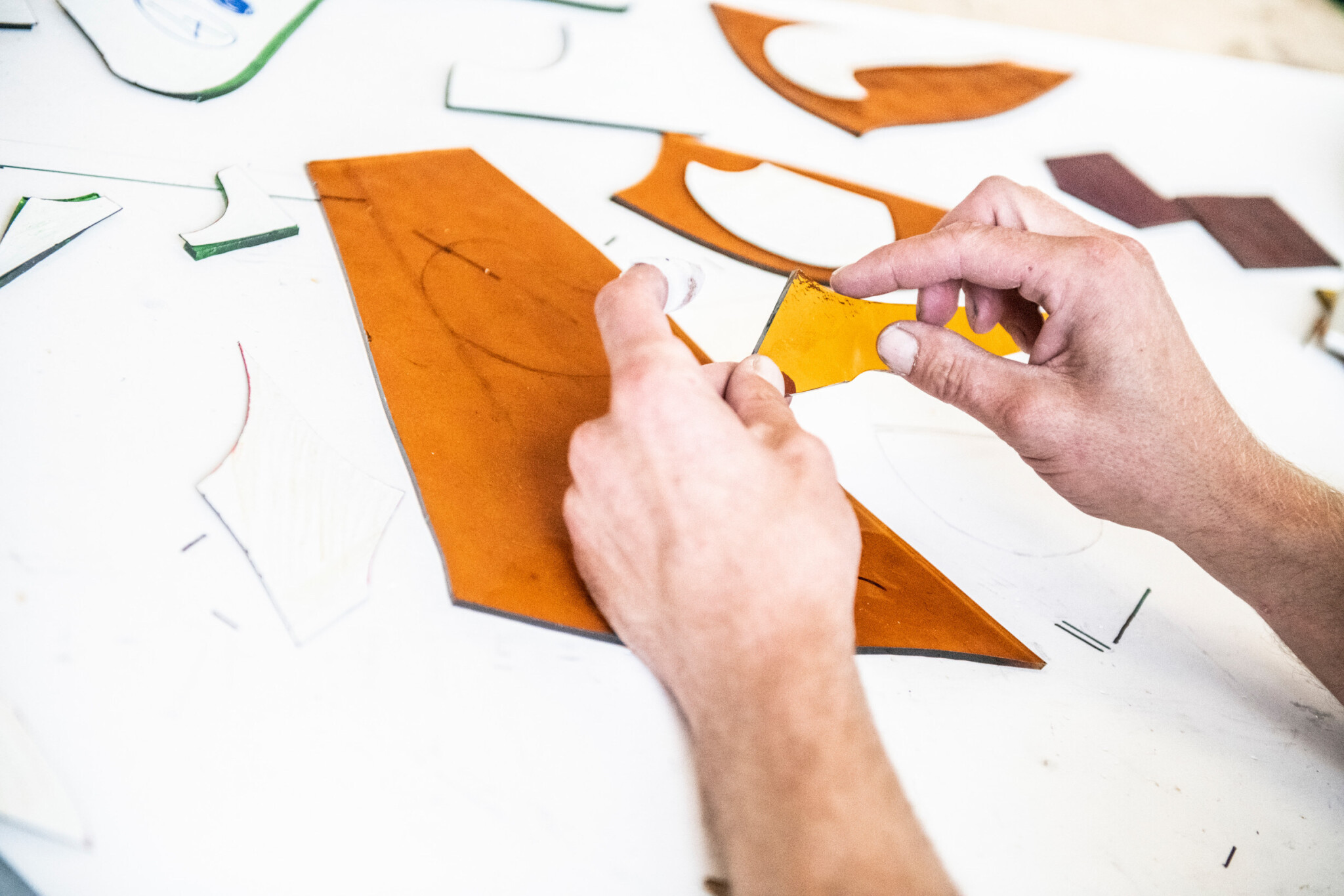 Po očištění putují vitráže na šuplíkách do dílny, kde se dořezávají chybějící díly. Sklář Eda zrovna podle šablony jedno ze skel vyrábí. „Takhle si to řezákem obtáhnu a pak kleštěmi vyštípnu. Když je to zubaté, tak si to na krystalce zaoblím,“ ukazuje na jednu z mechanických pomůcek. Jinak je všechno ruční práce, která vyžaduje trpělivost, zručnost i rozum. Když jsou díly nařezané, musejí je složit k sobě, jak patří, a připravit na spojení.