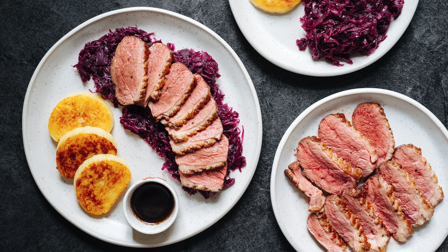 Pečená kachna na pomerančích a šalotce + brambory hasselback