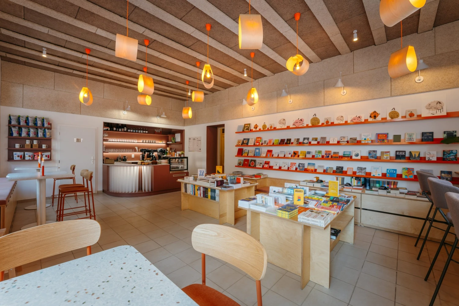 Naopak z každého rohu sálá příjemná vřelost a v jistém ohledu také hravost, kterou umocňují světla ve tvaru kapek a kruhů, sytě oranžové poličky na knihy, dřevěné sedáky židlí ve stejném barevném odstínu či bar evokující stránky knihy. Originální vizuální podobu interiéru mají na svědomí Jung architekti.