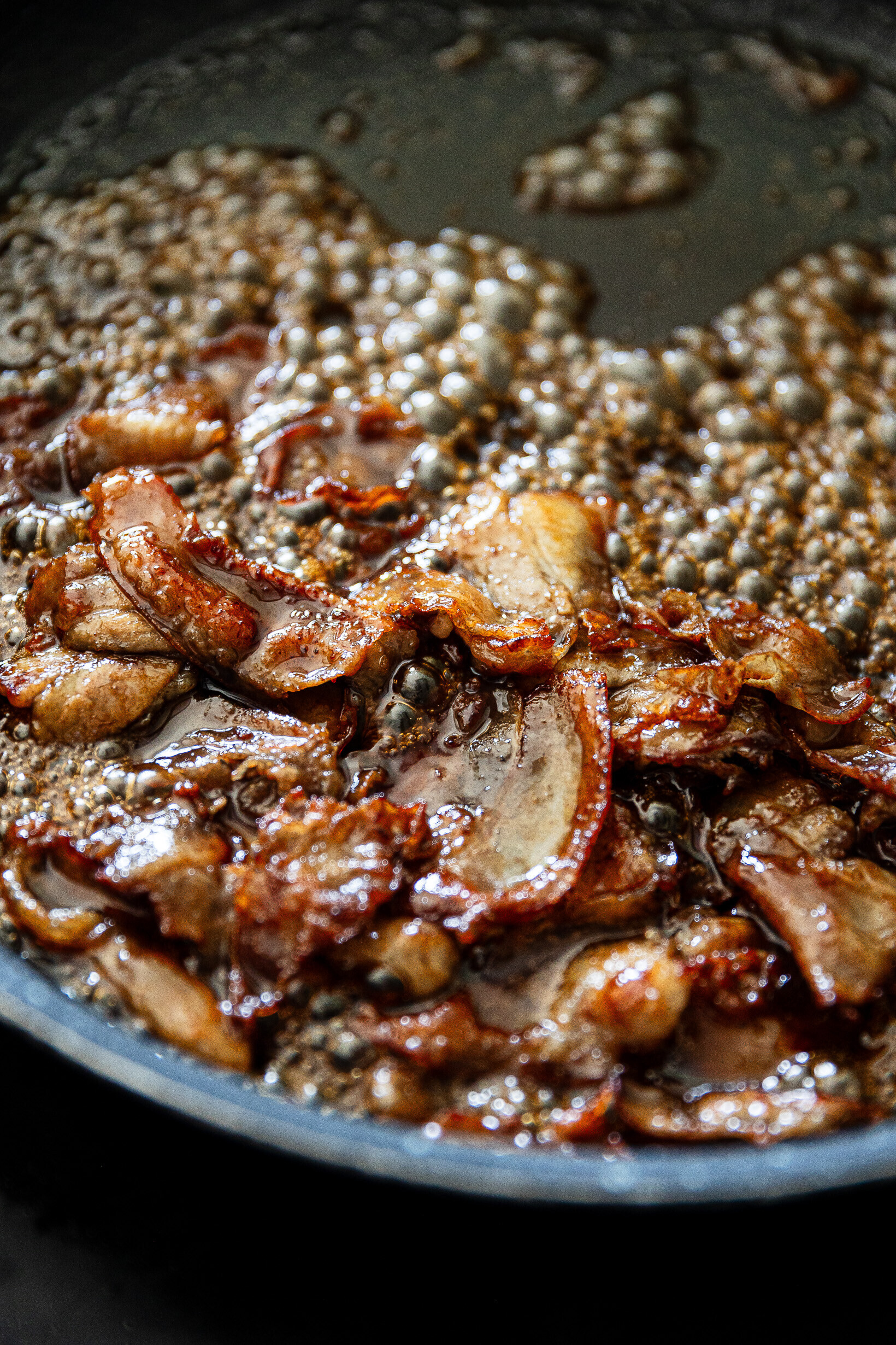 - Maso vhoďte do rozpálené pánve a zprudka opečte dozlatova, bude to trvat jen pár minut. Přidejte mirin, sójovou omáčku a med a ještě chvilku míchejte, až vznikne lesklá glazura. Ihned podávejte spolu s nudlemi.