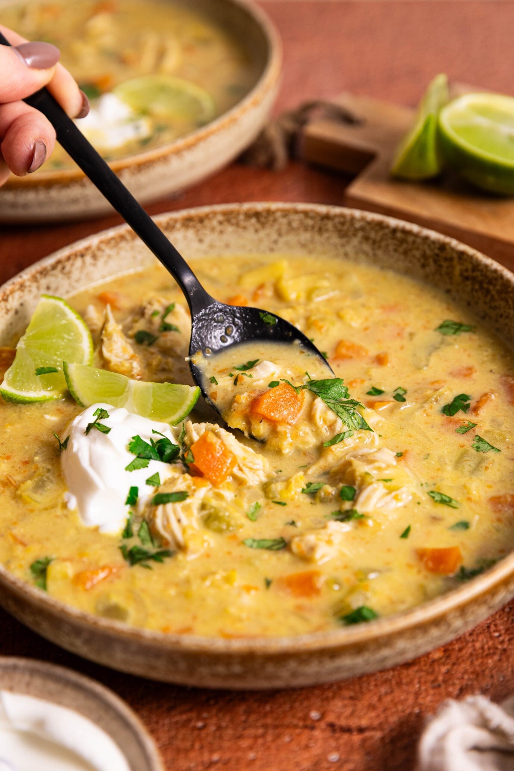 - Odeberte dvě naběračky polévky, rozmixujte je na kaši a vraťte zpátky do hrnce. Přidejte natrhané kuře a šťávu z poloviny limetky a společně krátce prohřejte. Pokud je polévka až moc hustá, přidejte ještě trochu vývaru.