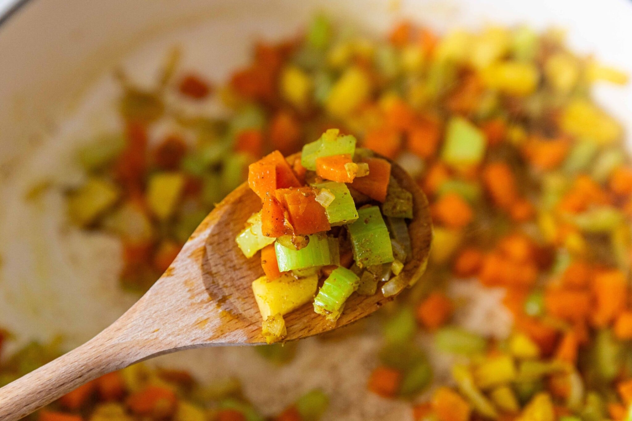 - Jablko, cibuli a mrkev oloupejte a spolu s řapíkatým celerem nakrájejte nadrobno. Rozpalte velký hrnec, jakmile je horký, přidejte do něj máslo a olej a společně zahřejte.