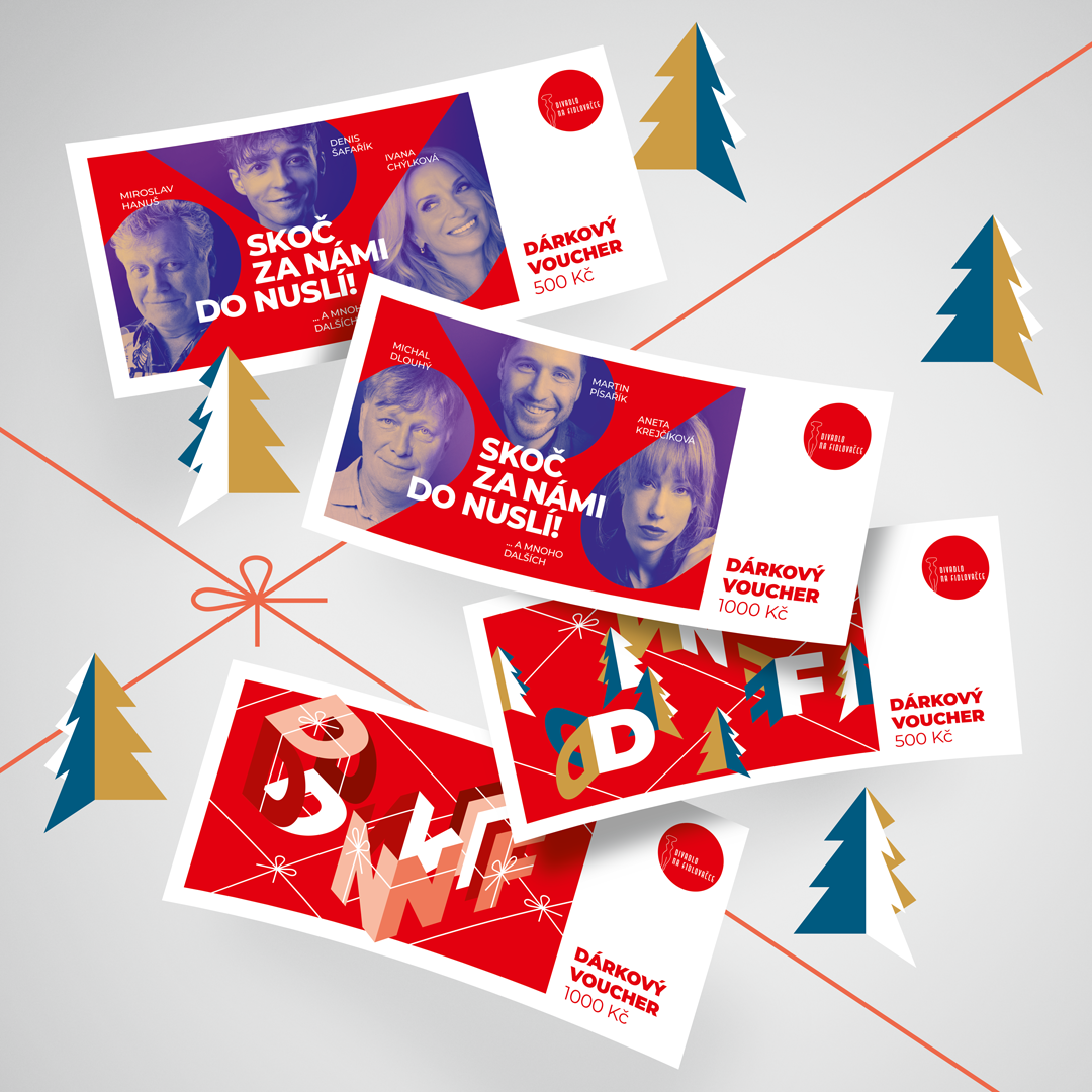 Dárkové vouchery Divadla Na Fidlovačce se nabízejí ve variantách 500 korun a 1000 korun, online prostřednictvím QR kódu a tištěné na pokladně divadla a na e-shopu. Platnost voucherů je rok od zakoupení.