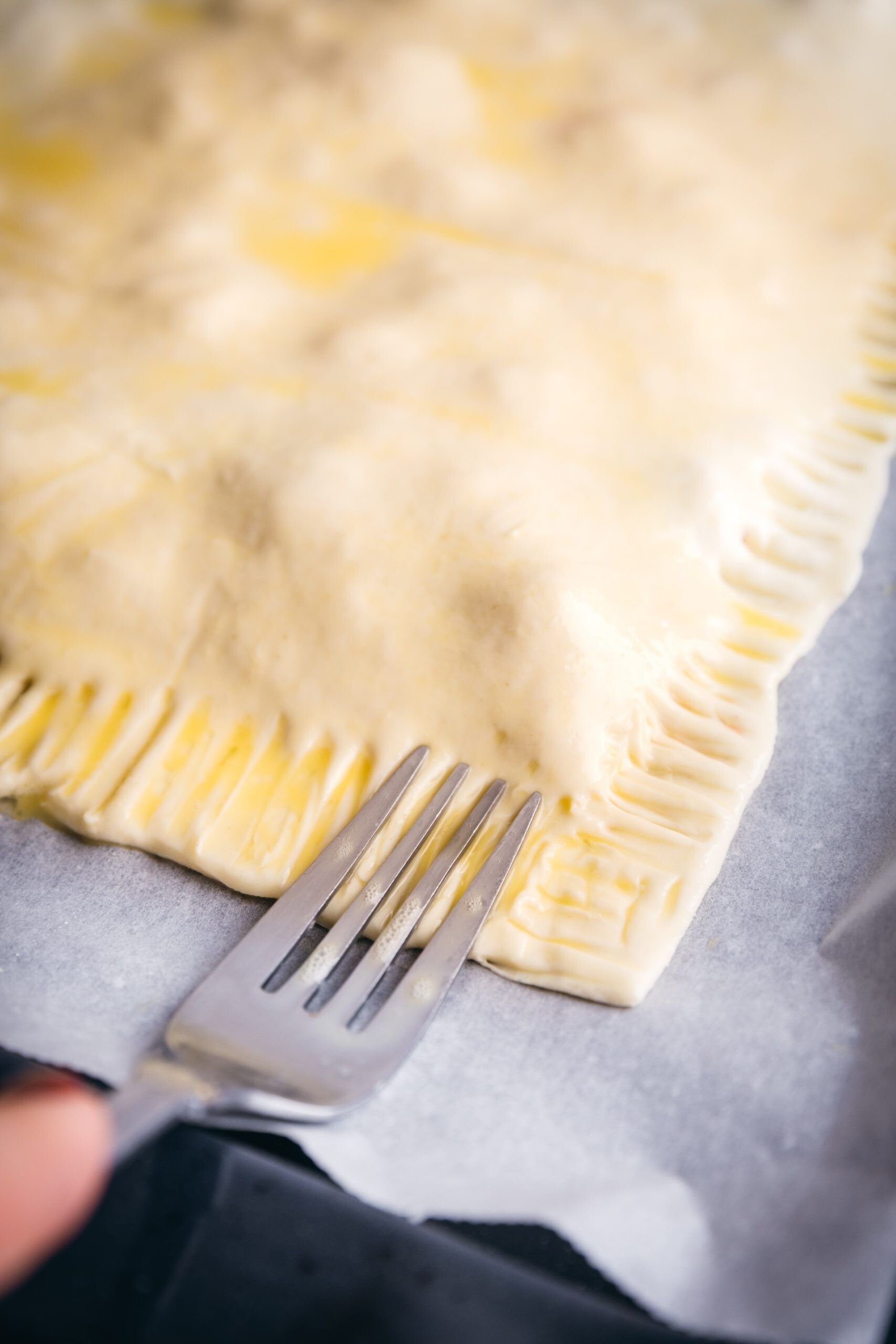 - Přiklopte plátem těsta, to potřete prošlehaným vajíčkem, párkrát propíchněte vidličkou, na stranách vytvořte vidličkou zářezy a těsto tak přitiskněte k plechu. Koláč vložte do předehřáté trouby na 20 až 25 minut či do doby, dokud nebude listové těsto vypečené a zlatavohnědé. Nechte vychladnout 10 minut na plechu, následně překlopte druhým plechem či prkýnkem a koláč obraťte.