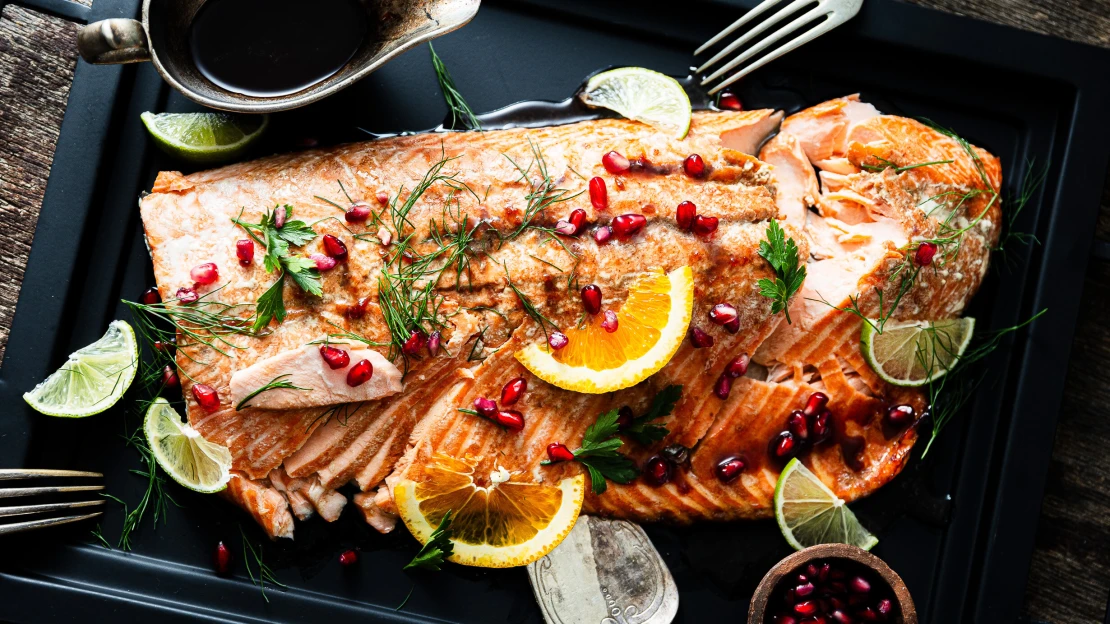 K lososu se hodí tóny citrusové, lehce kyselkavé i karamelizované. Glazura z granátového jablka je zajímavým dochucovadlem sama o sobě a rybě dodá zároveň pěknou barvu. Semínka granátového jablka, čerstvé bylinky a plátky citrusů chuť (na) lososa pak ještě více podpoří.