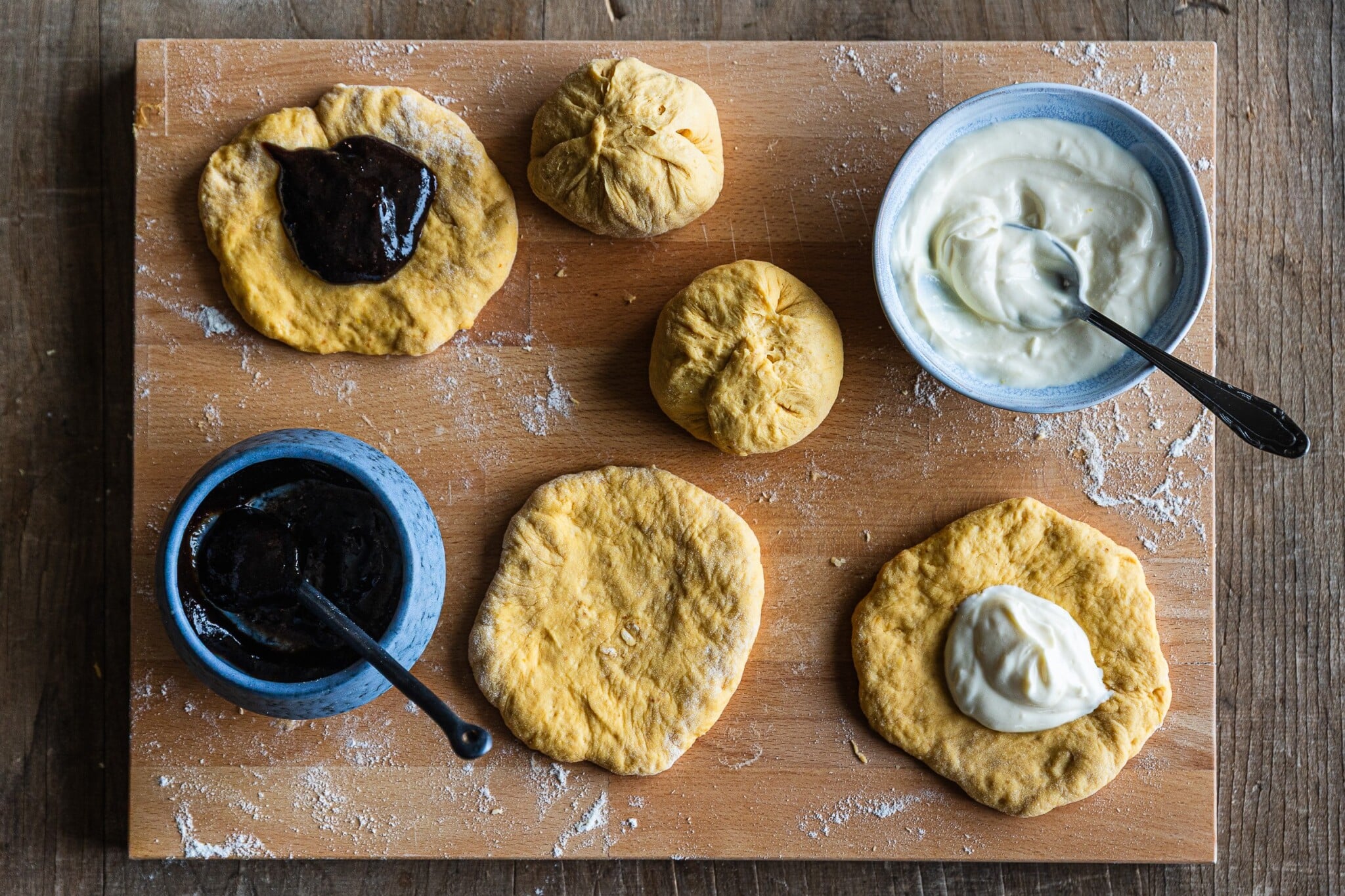 - Mezitím si připravte náplně. Povidla rozmíchejte s rumem nebo lžící horké vody (doporučujeme rum!). Dochuťte je skořicí a citronovou šťávou.