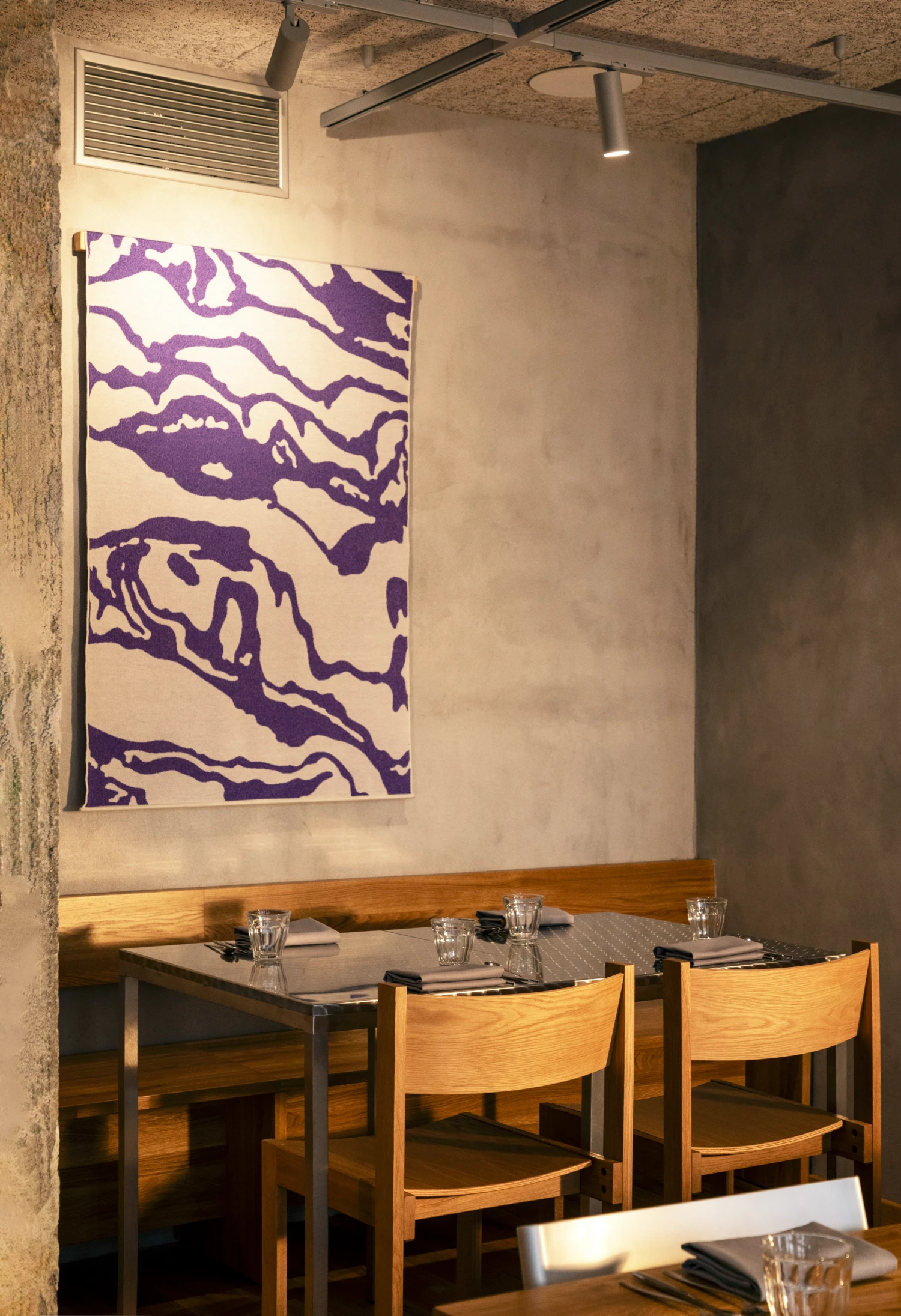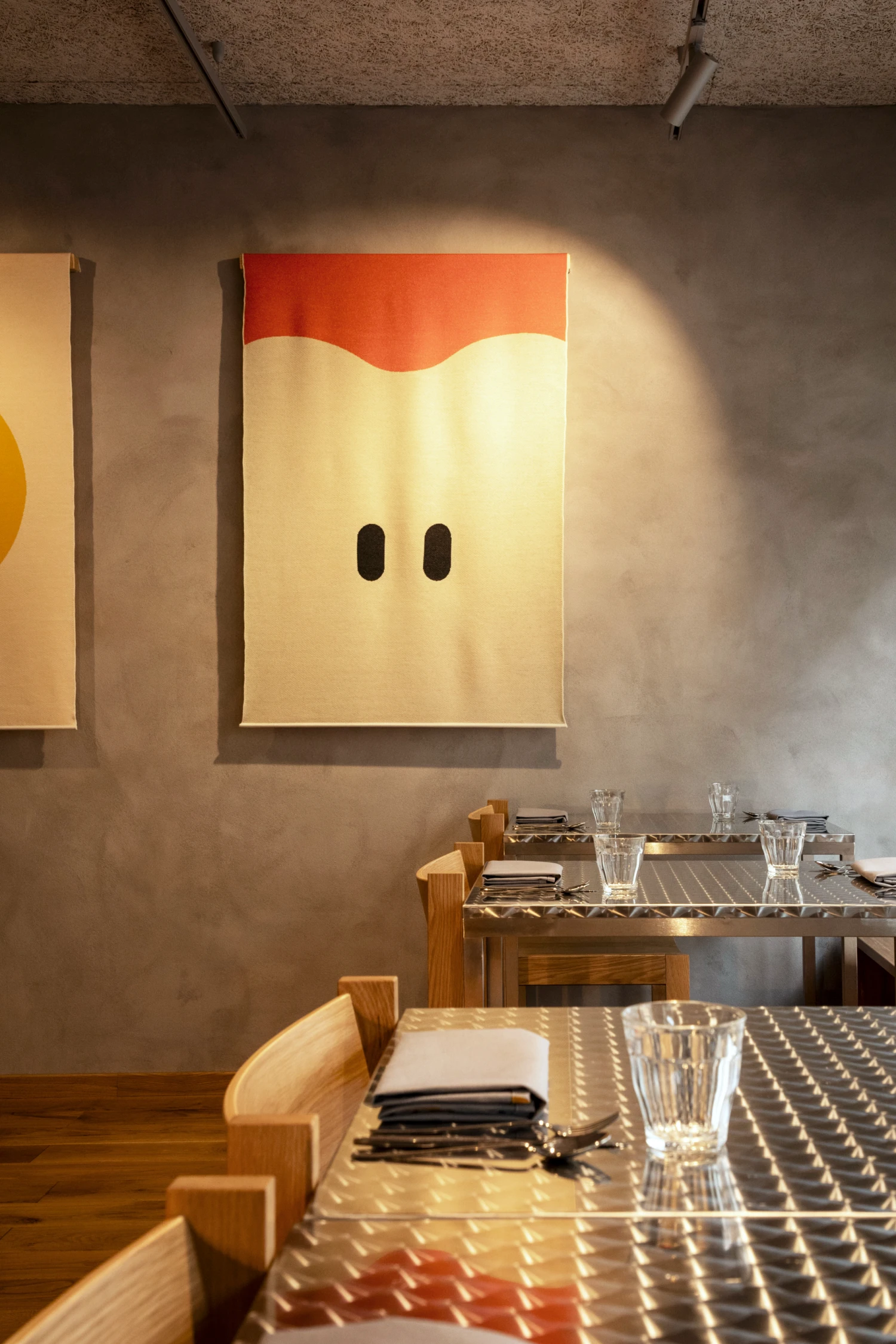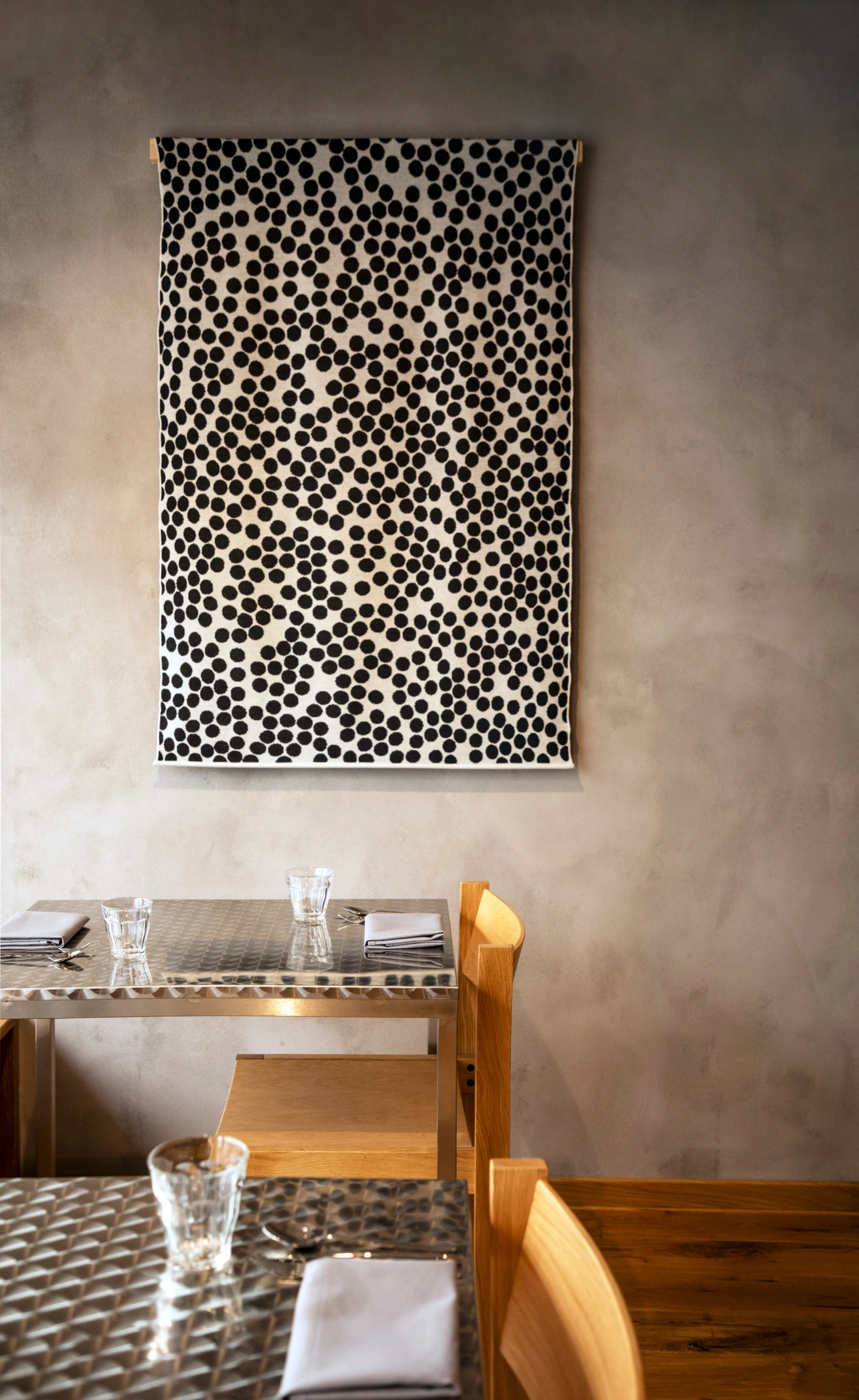 Čtyři vlněné obrazy s motivy jablíčka, zelí, máku a vajíčka visí v Ódě za plného provozu. Nepředstavuje ale volba podobného materiálu v gastro provozu určité limity?