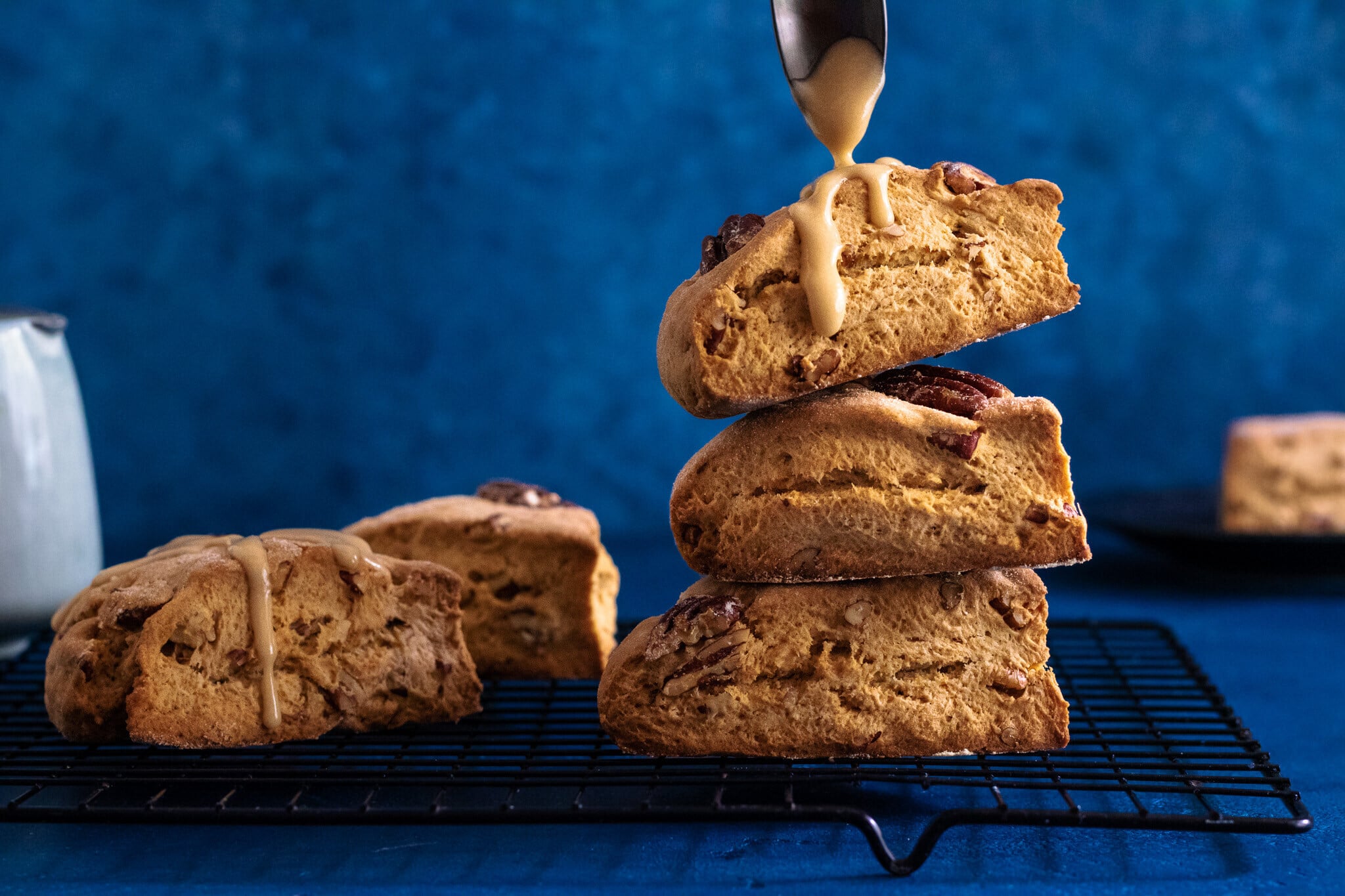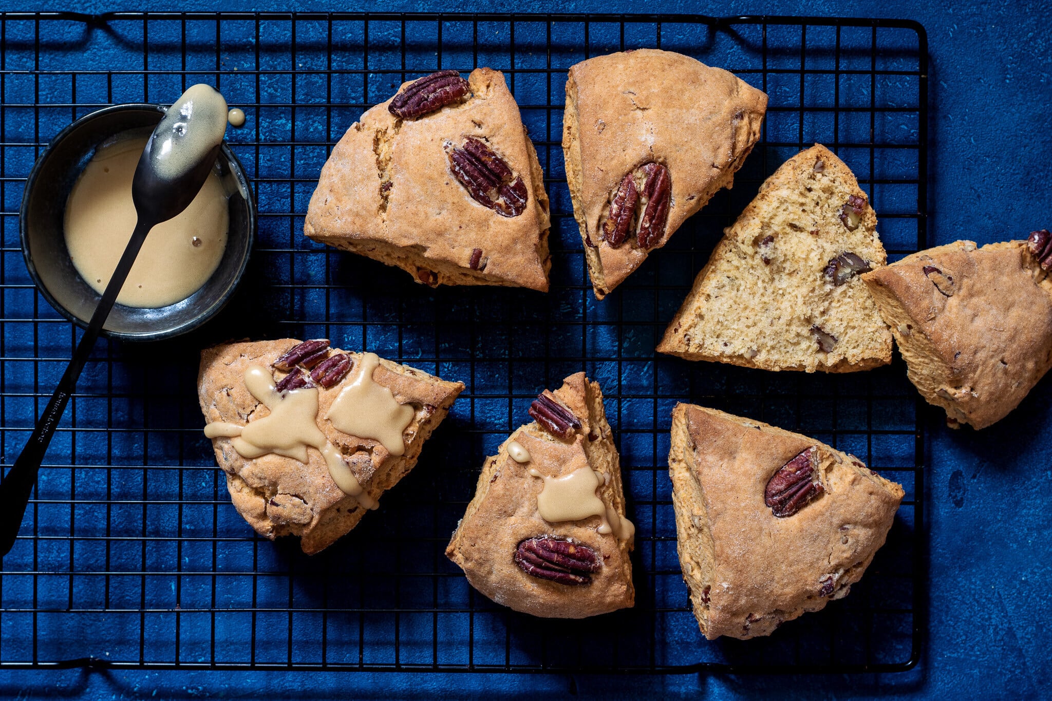 Pekanové nekynuté koláče scones s javorovým sirupem