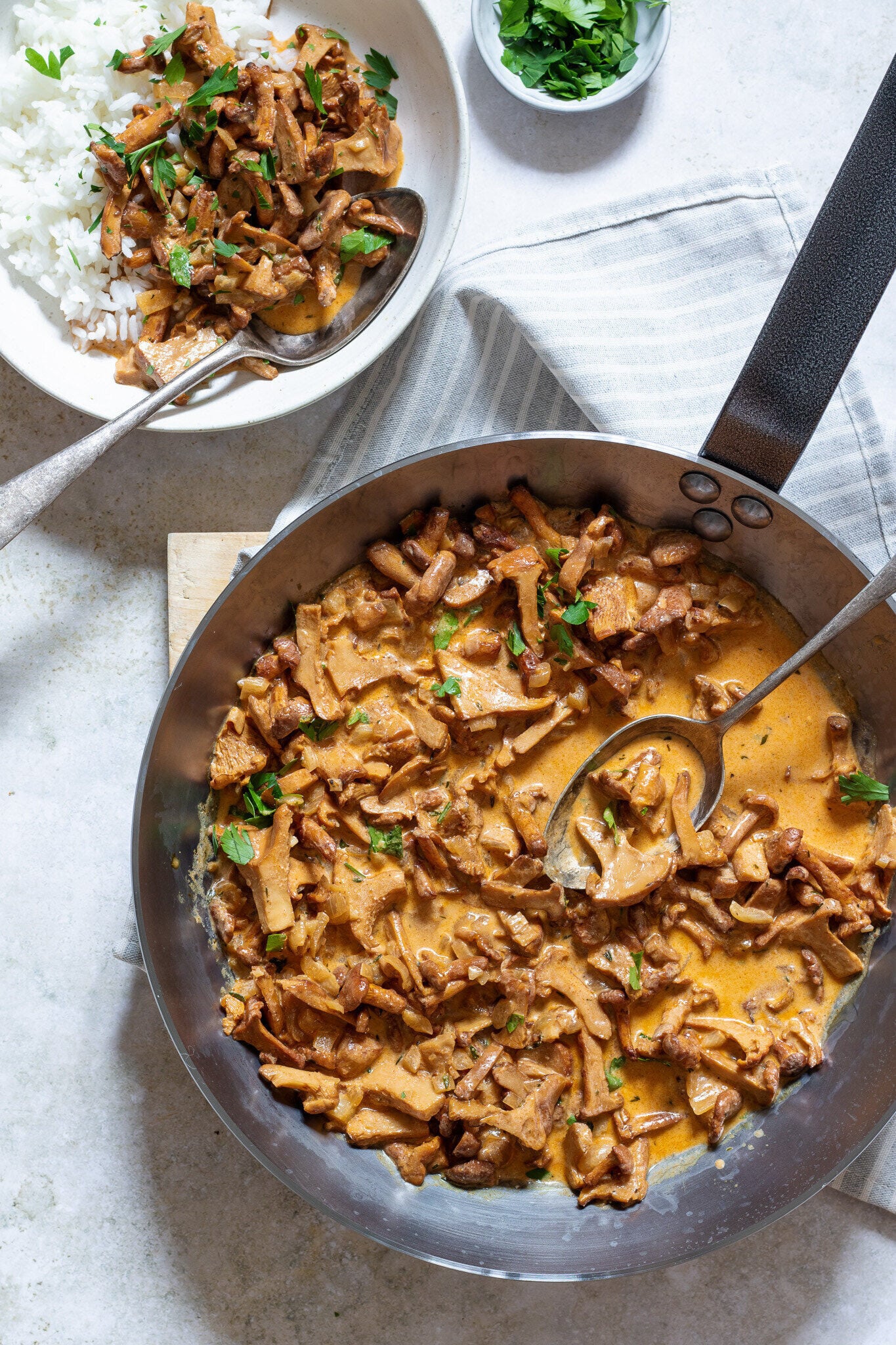 Náš vegetariánský Stroganoff si můžete připravit z hub, které najdete v lese. Hlavní ingredience vás tak nebude stát víc než pobyt na čerstvém vzduchu, takže vás ve výsledku maximálně obohatí. Ideální jsou pevnější, drobnější kusy hub. Můžete je ale nahradit i žampiony. Naopak příliš nedoporučuji hlívu, která se dlouho vaří, než změkne. Pokud ji ale chcete použít, guláš vařte déle a přilijte tak i více vývaru, jelikož se ho více odpaří.