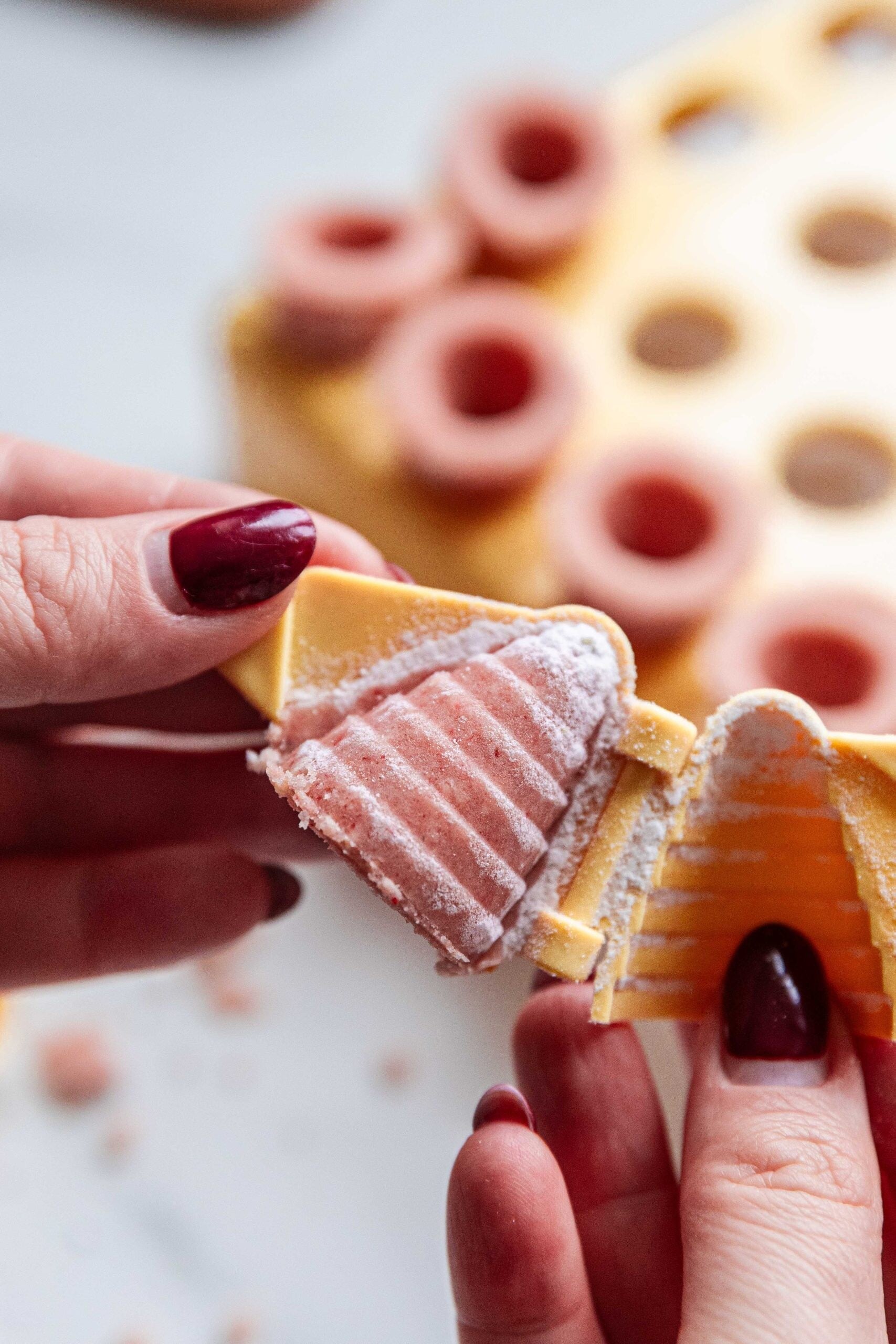 Malinové včelí úly: Stejným způsobem vyrobíte malinové úlky, stačí lyofilizované jahody a džem vyměnit za malinou variantu.