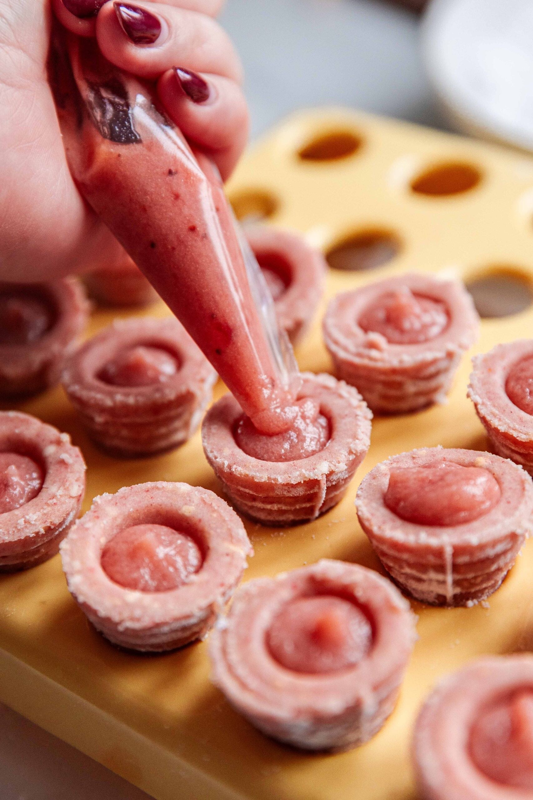 - Odřízněte přebytek těsta, poté tvořítko vyndejte a formičku opatrně otevřete. Pokud máte stojánek, vytvarované úlky do něj odkládejte a pokračujte dál, dokud celý stojánek nezaplníte. Vytvarované úlky pomocí sáčku naplňte připravenou jahodovou náplní a každý kus přiklopte piškotem nebo domácím lineckým kolečkem. Překlopte piškotem dolů a dejte alespoň na jeden den odležet do lednice, kde toto vánoční cukroví také skladujte.