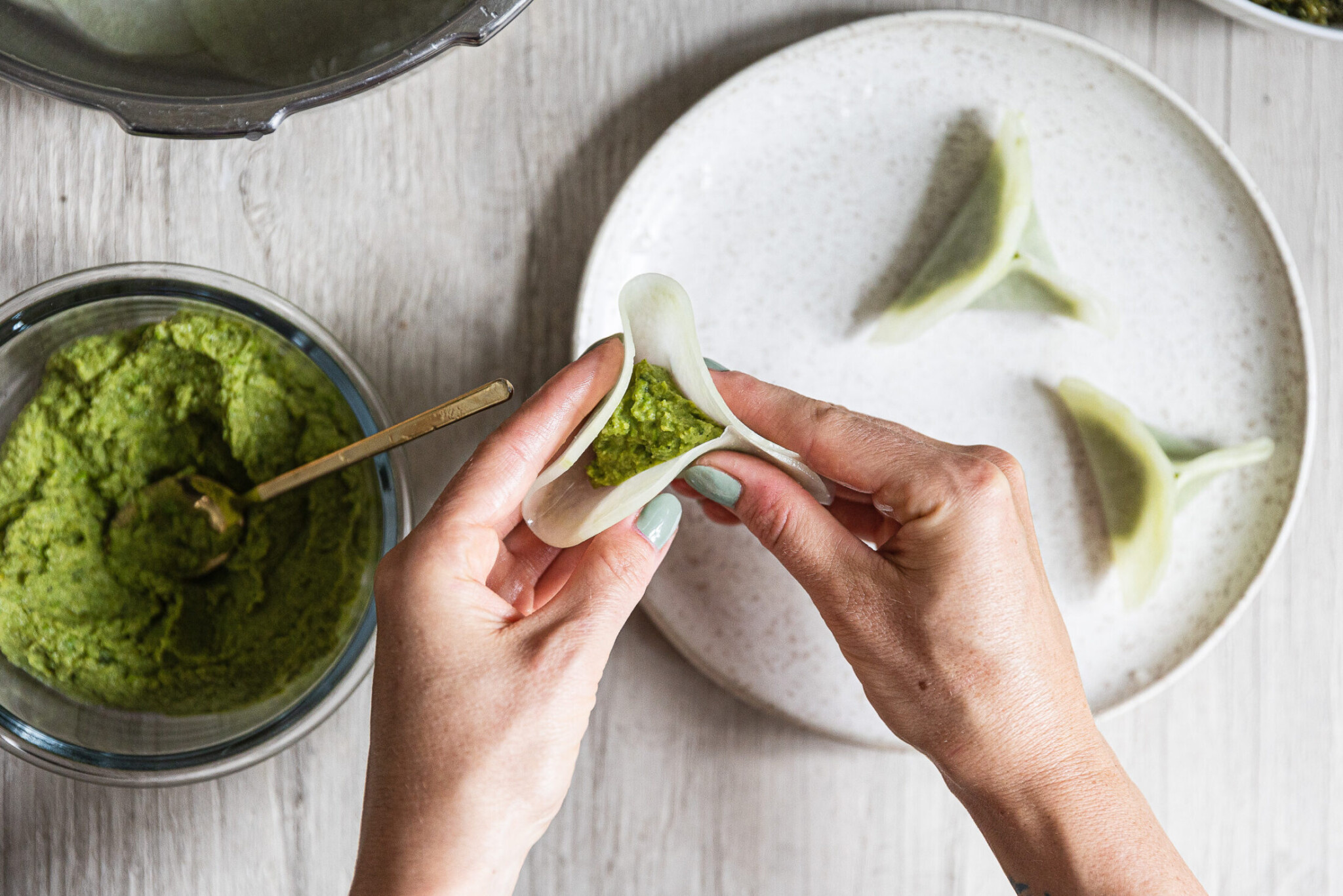 - Mezitím si připravte náplň: hrášek na minutu vhoďte do vroucí vody, propláchněte vodou studenou a rozmixujte s nasekanou mátou, česnekem, miso pastou, olivovým olejem a citronovou šťávou.