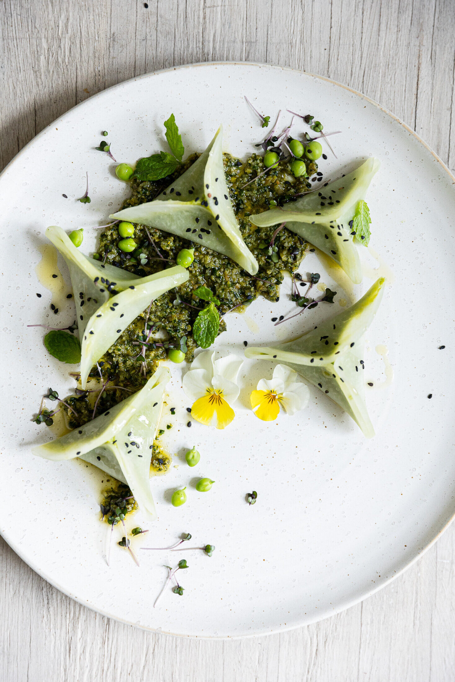 Dopřejte si dávku čerstvé jarní zeleniny v poněkud zábavnější podobě, než je klasický salát! Kedlubnové ravioly plněné svěží hráškovou pastou s mátou a semínkovým pestem vás budou bavit o poznání více a poslouží jako elegantní předkrm také pro celiaky a vegany.