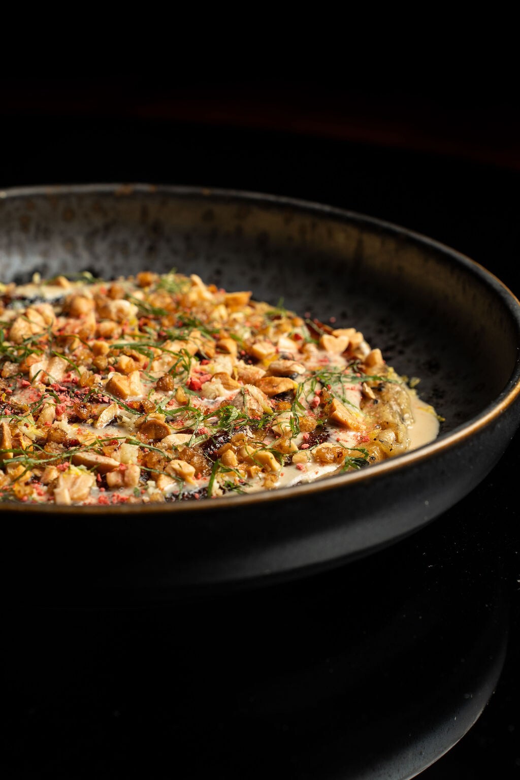 Nové menu je zhruba z poloviny obohacené o nová jídla a ta opravdu stojí za to. Mě nejvíc nadchlo carpaccio z lilku. Lilek opékají na otevřeném ohni, což ho samo o sobě perfektně dochutí a dodá tak akorát kouřovou chuť. Je doplněný o miso, tahini, drcené oříšky a lyofylizované maliny, dokonalá hra chutí.