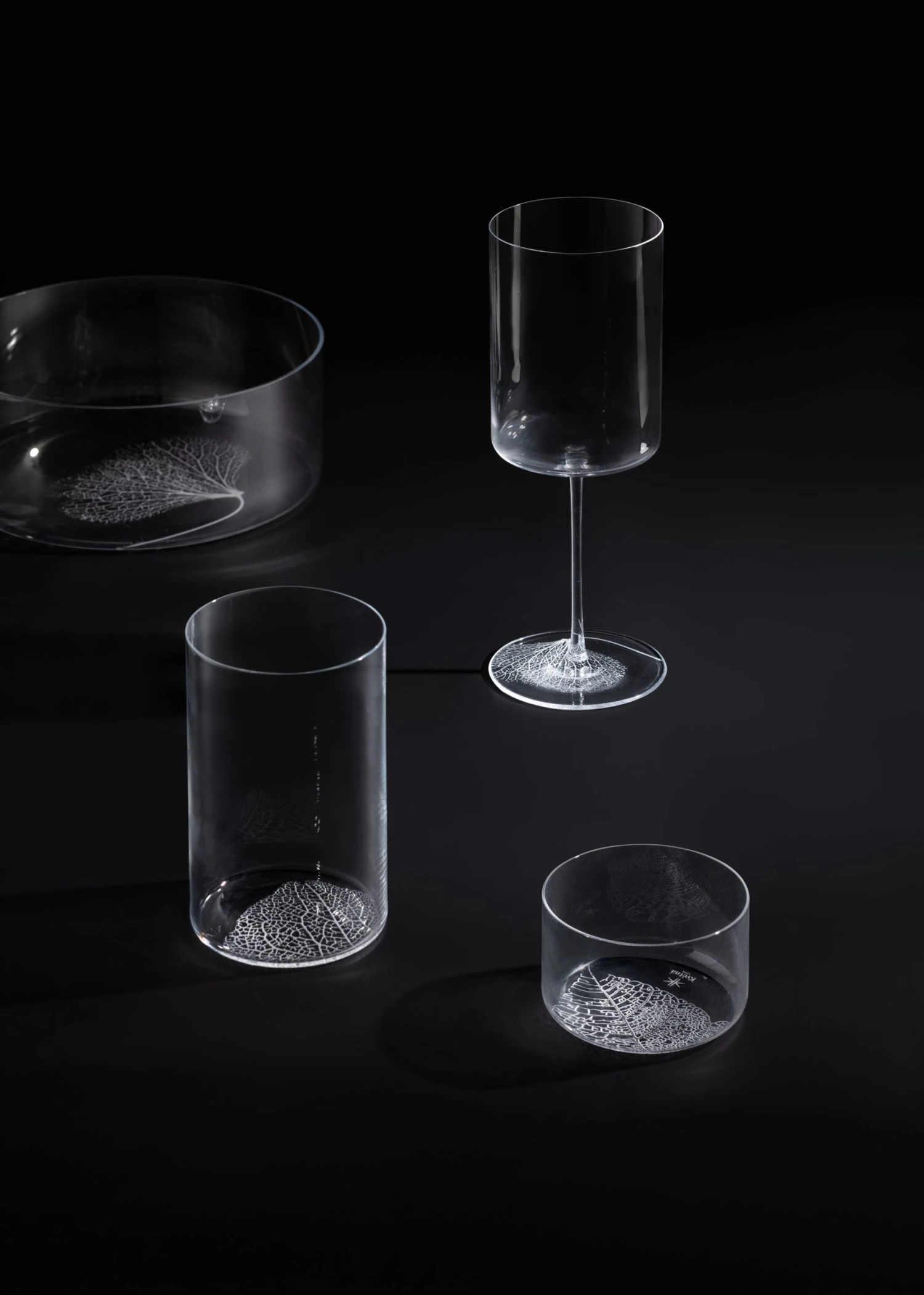 „Kolekce propojuje dvousetletou moravskou sklářskou tradici s poetickou vizí japonského architekta Kenga Kumy. Minimalistické formy s jemným otiskem listové žilnatiny na dně evokují tichý dialog člověka a přírody při každém napití,“ připomíná Jan Press.