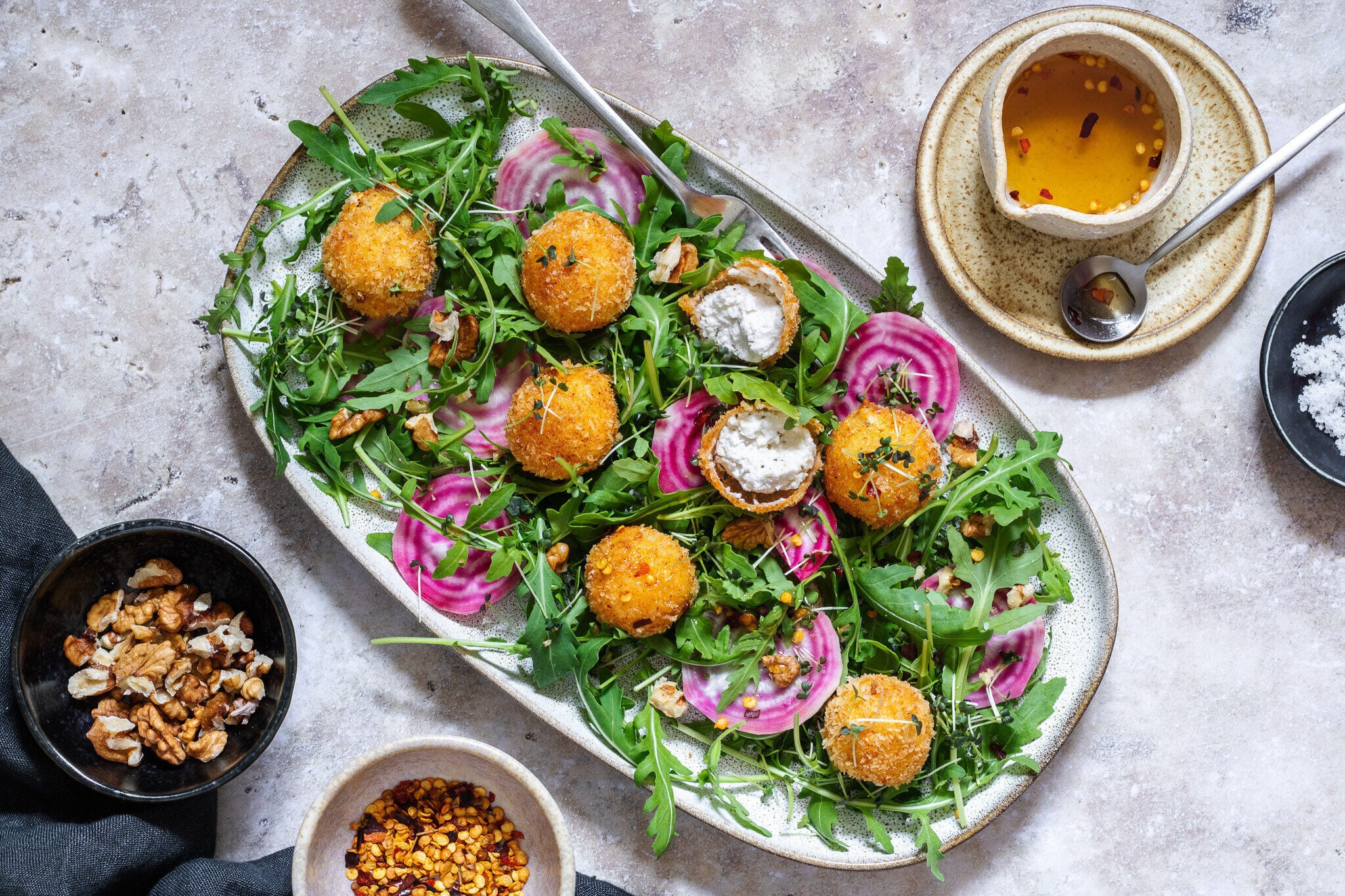 - Krokety můžete podávat jen tak anebo servírovat se salátem s červenou řepou. Tu můžete do salátu nakrájet čerstvou i předvařenou. Nasládlá zálivka se dobře vyvažuje s jemně hořkou a pikantní rukolou. Využijete ji tedy nejen pro doplnění samotných kuliček, ale právě i pro přelití salátu. Salát doplňte ořechy a různými typy microgreens a klíčků.