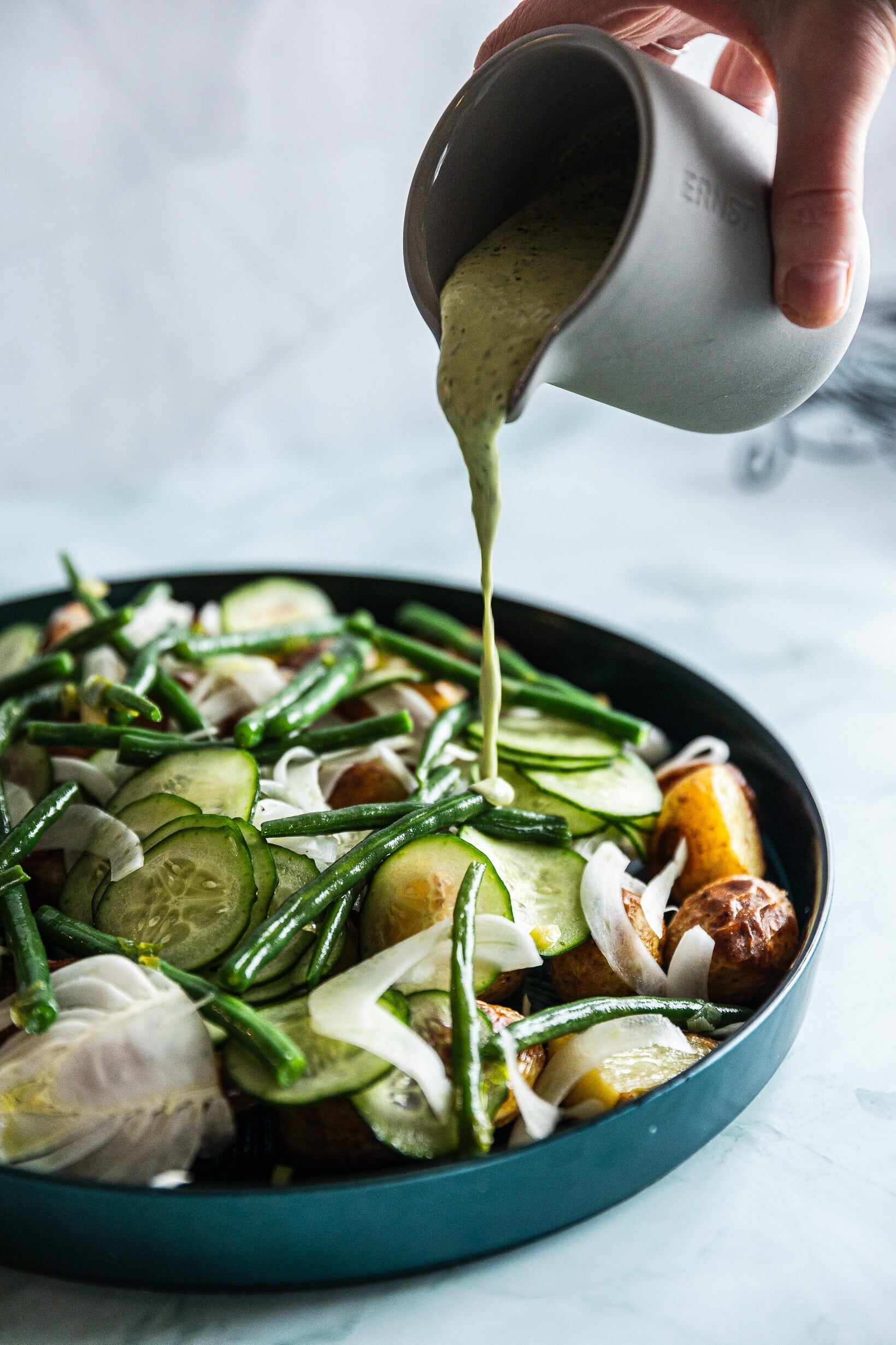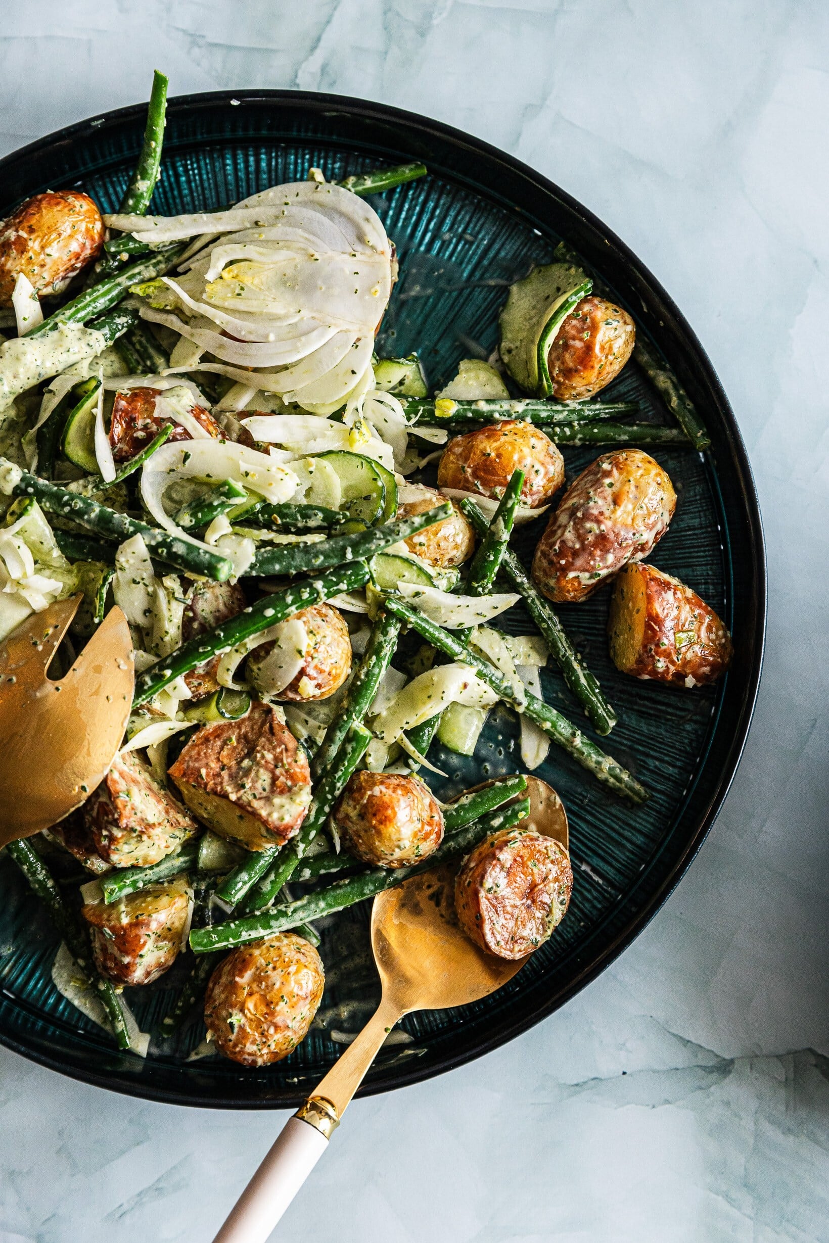 Pečené brambory a křupavé zelené fazolky spojuje krémový dresink se svěžími tóny citronu a kaparů. Výsledkem je lehký, svěží, a přitom příjemně sytý salát plný chuti.