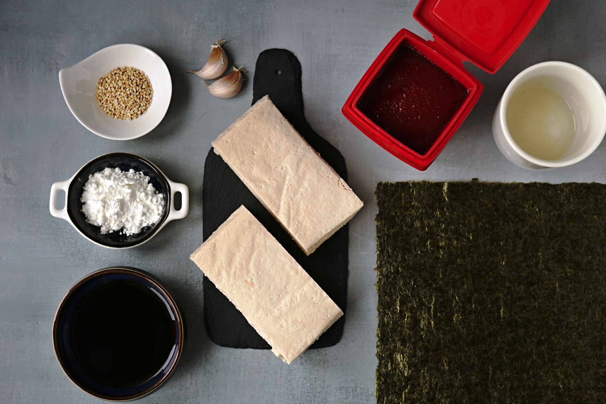 - Tofu osušte a plát nori rozstřihněte tak, aby odpovídal šířce bloku tofu.
