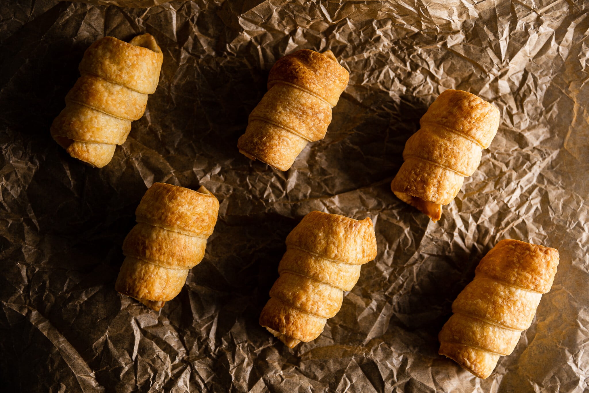 - Kremrole vyskládejte na plech vyložený pečicím papírem s dostatečným rozestupem a pečte při 190 °C asi 15 minut dozlatova. Nechte je chvilku vychladnout a pak opatrně sejměte z kovových trubiček. Pokračujte s obtočením dalších proužků kolem trubiček. Podle toho, jaký počet kovových trubiček vlastníte, „otočíte“ množství plechů v troubě.