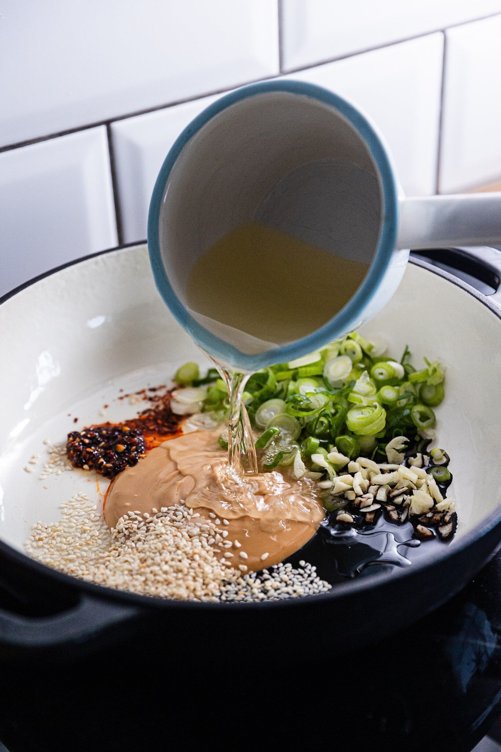 - Do větší studené pánve dejte arašídové máslo, chilli olej, chilli vločky, rýžový ocet, sójovou omáčku, sezamová semínka, česnek i jarní cibulku nakrájenou nadrobno.