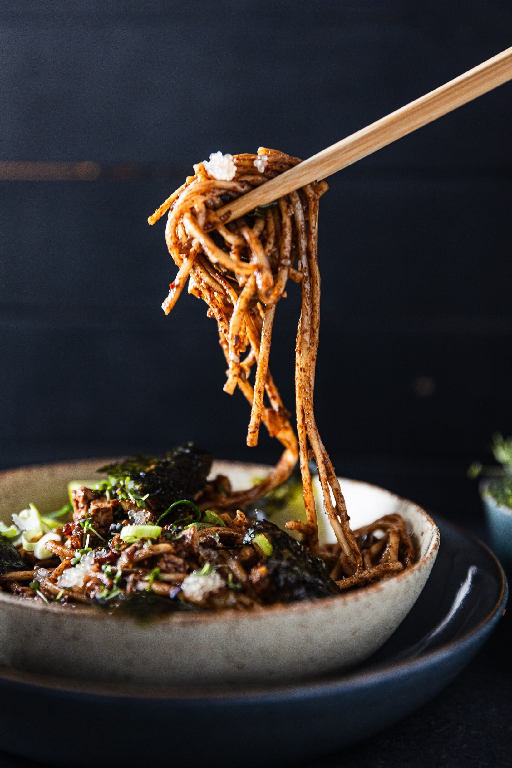 Stačí nachystat ingredience a v pánvi to jen zasyčí. Pikantní chuť nudlí příjemně osvěží drobné bylinky i limetový kaviár. Překvapivým zpestřením je pak křehká řasa nori.