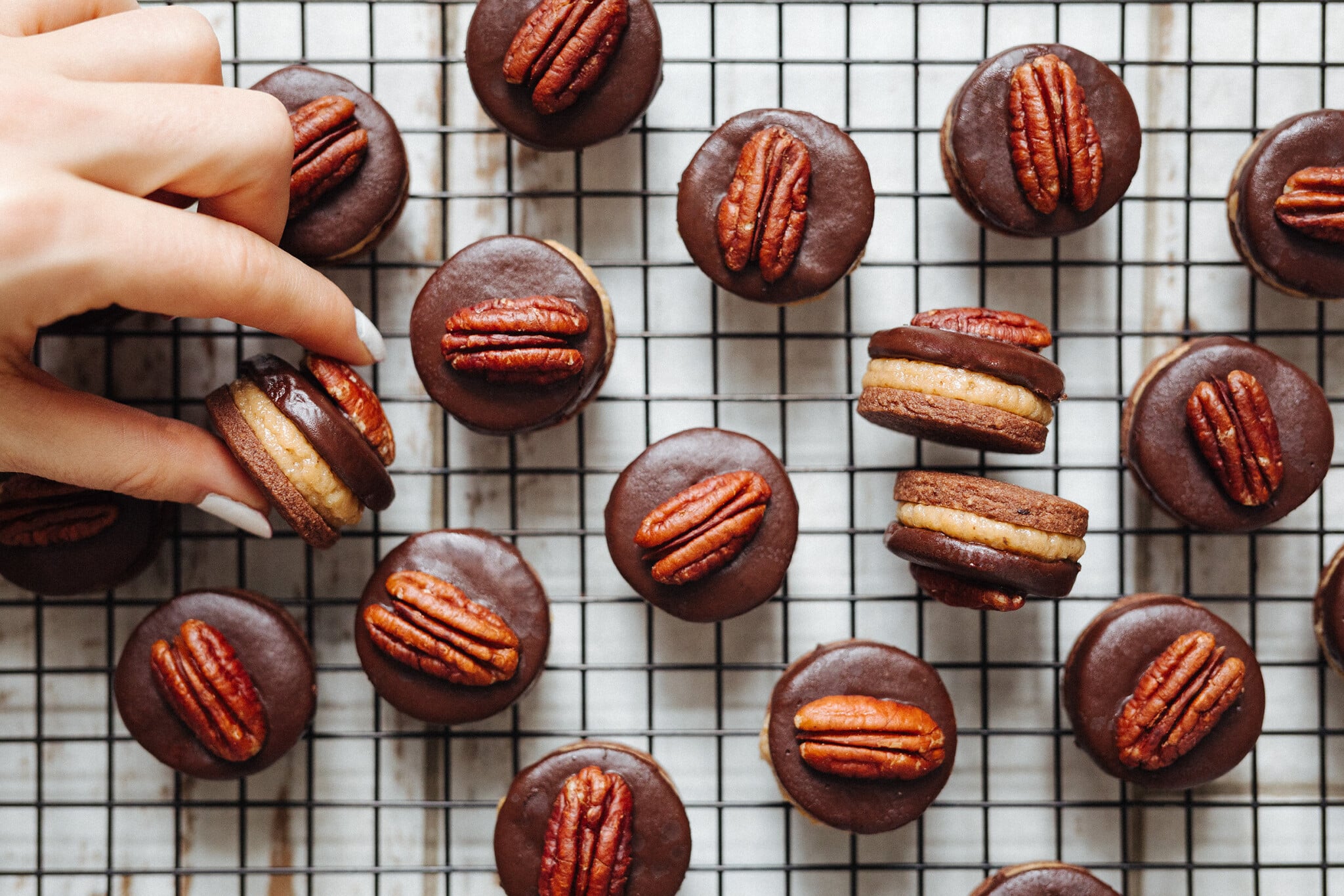 - Druhou polovinu koleček pak otočte a zdobicím sáčkem s hladkou špičkou na každém udělejte kopeček z náplně. Přiklopte kolečkem s polevou (držte ho za ořech, aby se poleva nenarušila) a přitiskněte ho tak, aby se náplň vytlačila až k okrajům.