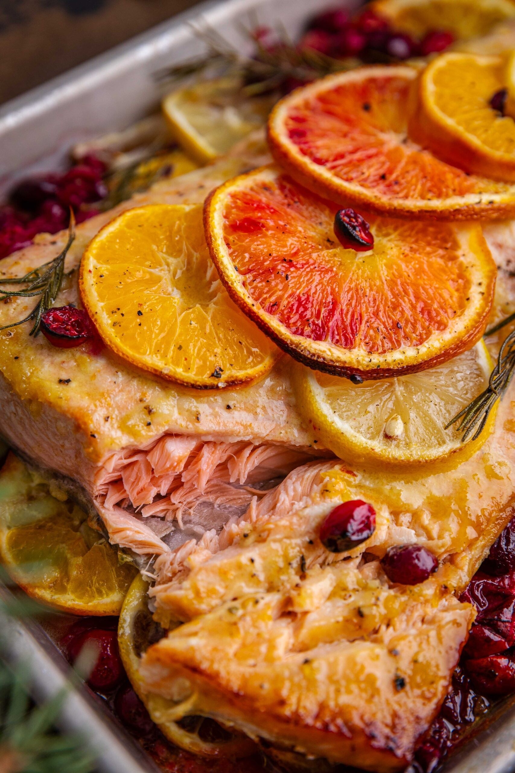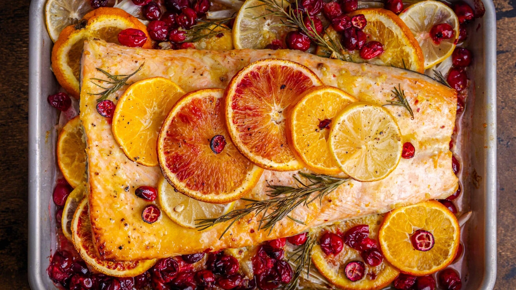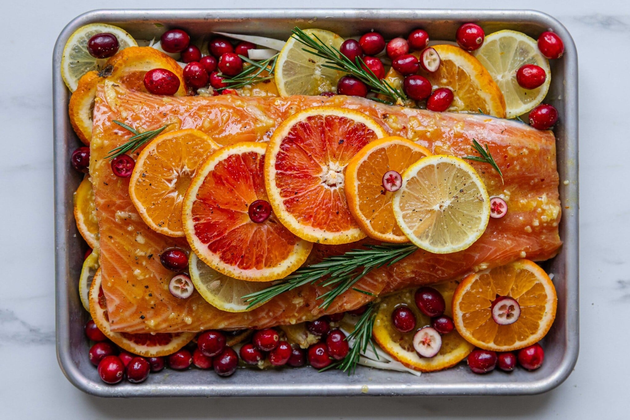 Vánoční pečený losos s fenyklem, brusinkami a citrusy