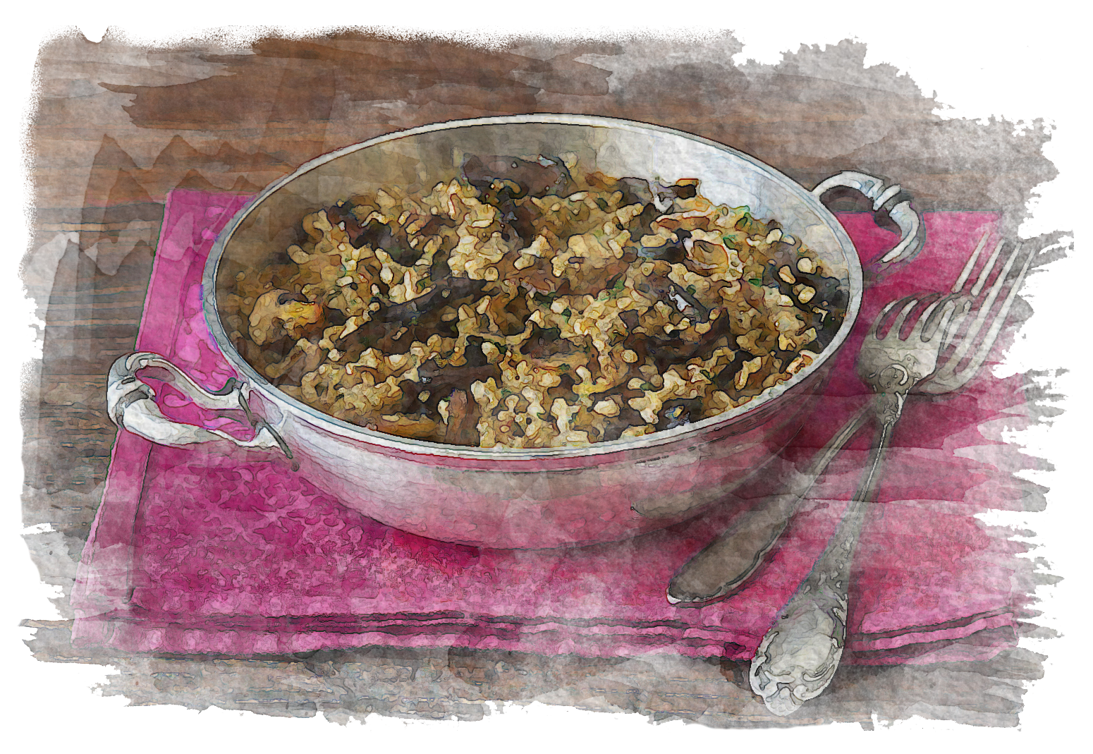 Přidejte namočené nakrájené houby a vrchovatou lžičku majoránky. Chvíli restujte, pak vmíchejte v páře předvařené kroupy a podlijte zbylou houbovou vodou – hladina by neměla být nad kroupami. Přidejte houbový prach a za stálého, pomalého míchání postupně vyvařte téměř všechnu tekutinu.