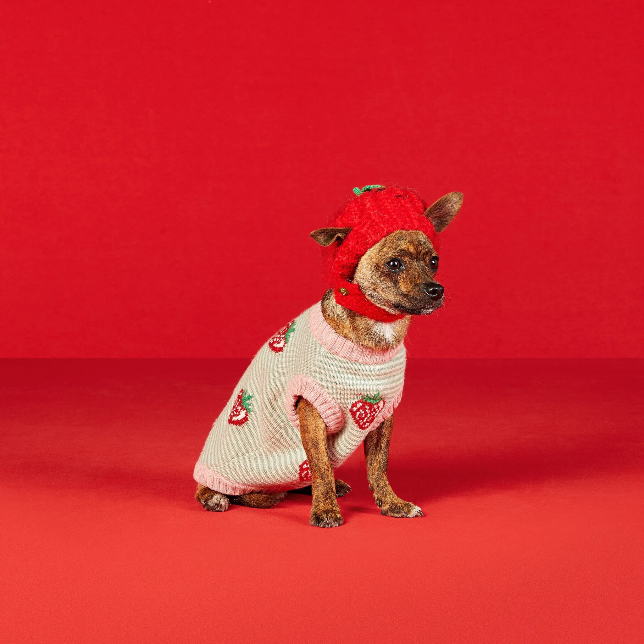 Módní dům Gucci nabízí také velmi elegantní oblečení pro psy. Třeba bavlněné květované tričko s límečkem za šest tisíc korun, pláštěnku s tradičním Gucci monogramem za sedmnáct tisíc korun, velmi seriózní svetřík z vlny a mohéru za osm tisíc korun, ale i oblečení s rozverným motivem jahod – a nechybí dokonce ani vlněná čepice ve tvaru jahody za stejnou cenu.