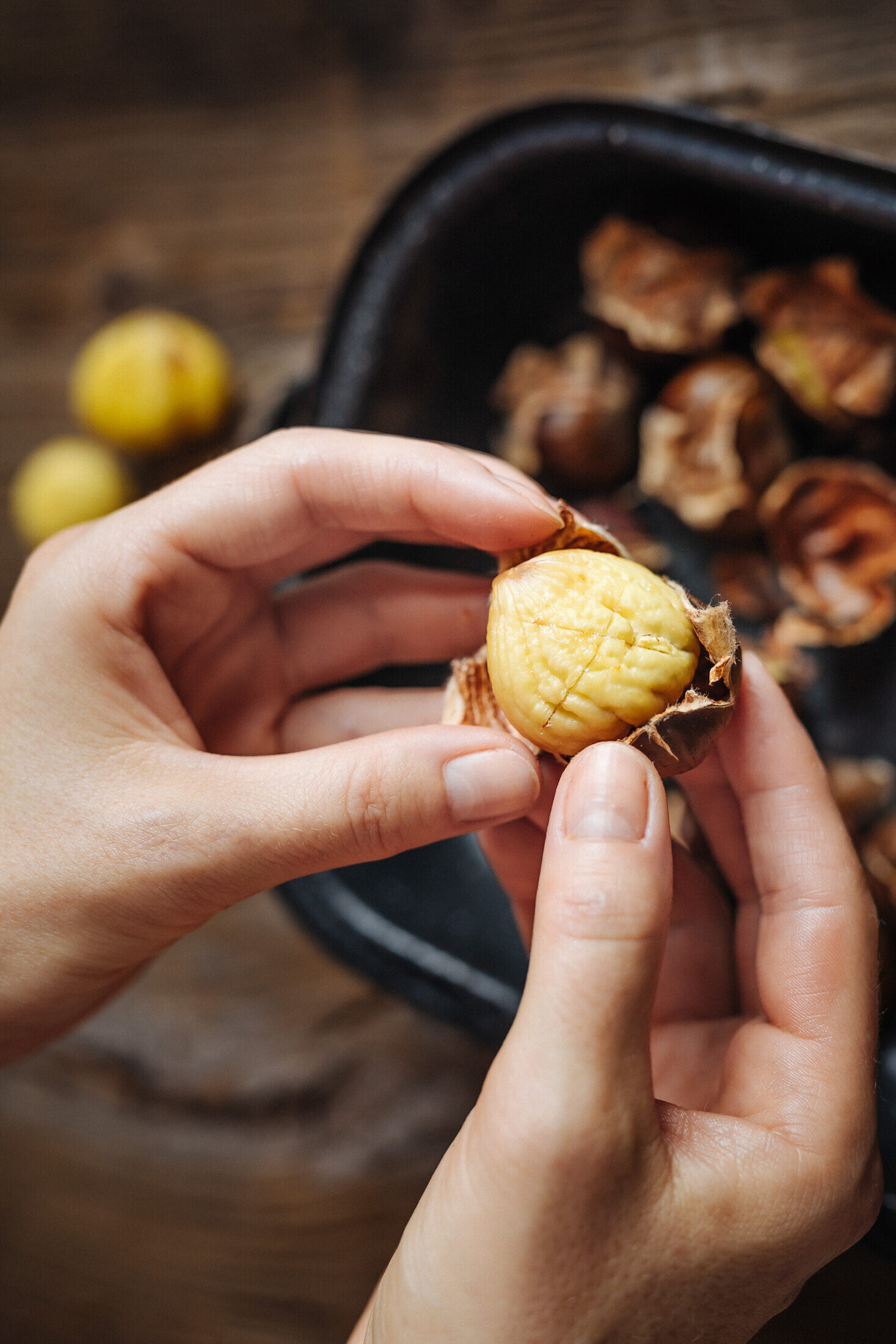 - Kaštany při nákupu vybírejte pečlivě, jsou totiž náchylné k plísním. Proto je také spotřebujte co nejdříve po zakoupení. V rendlíku je zalijte vodou, přiveďte ji k varu, 5 minut povařte, vypněte a kaštany nechte 30 min ve vodě, aby jim změkla slupka.