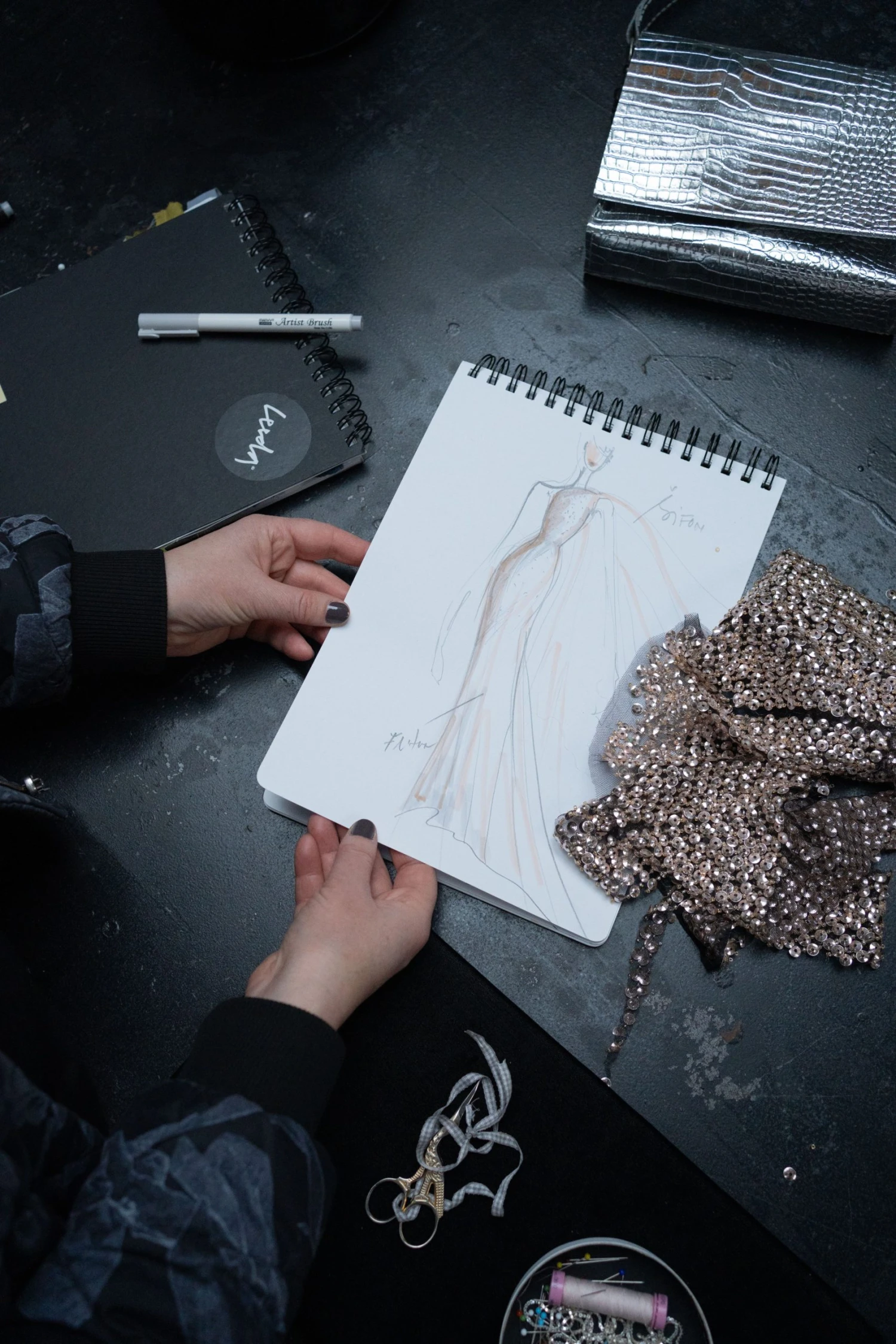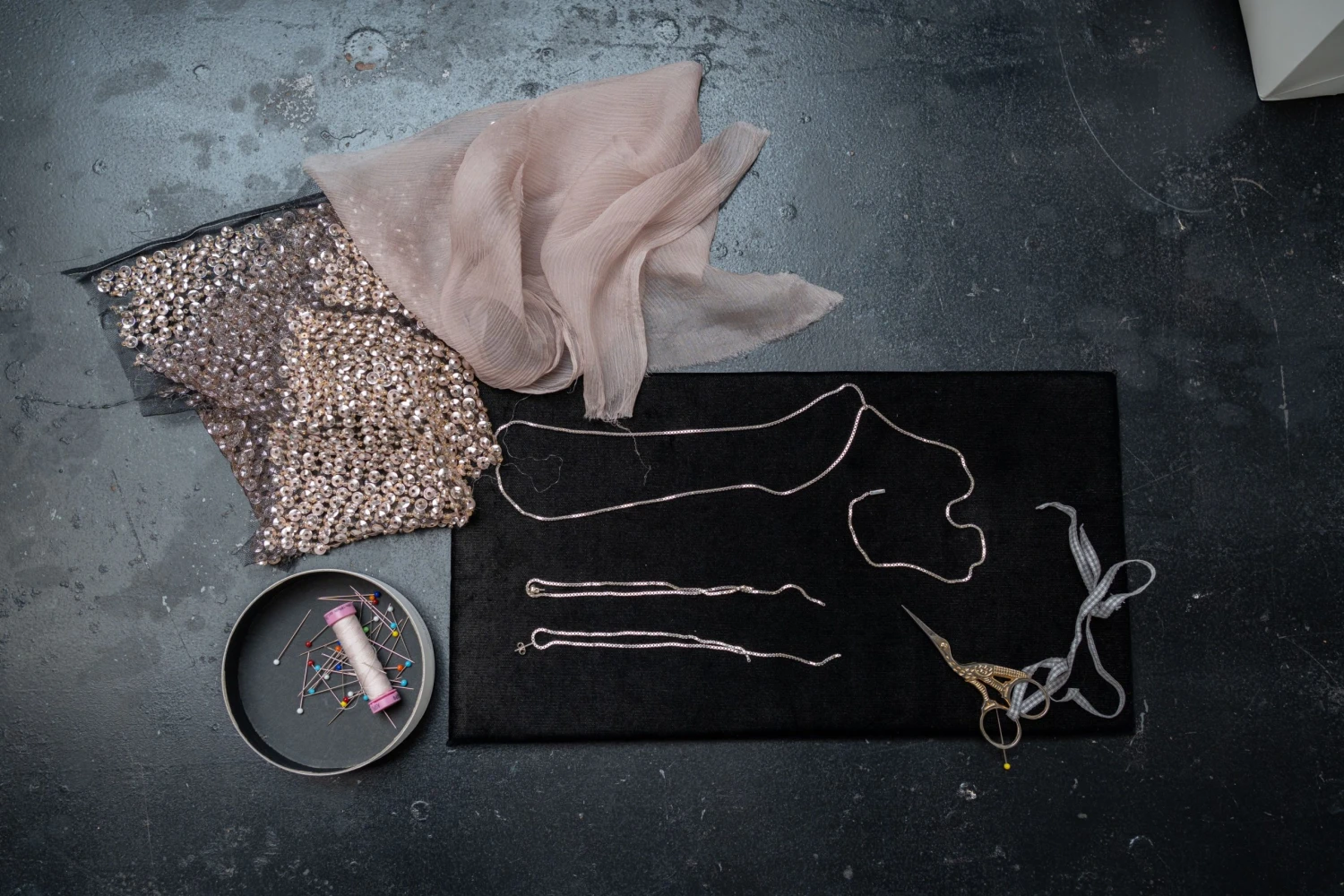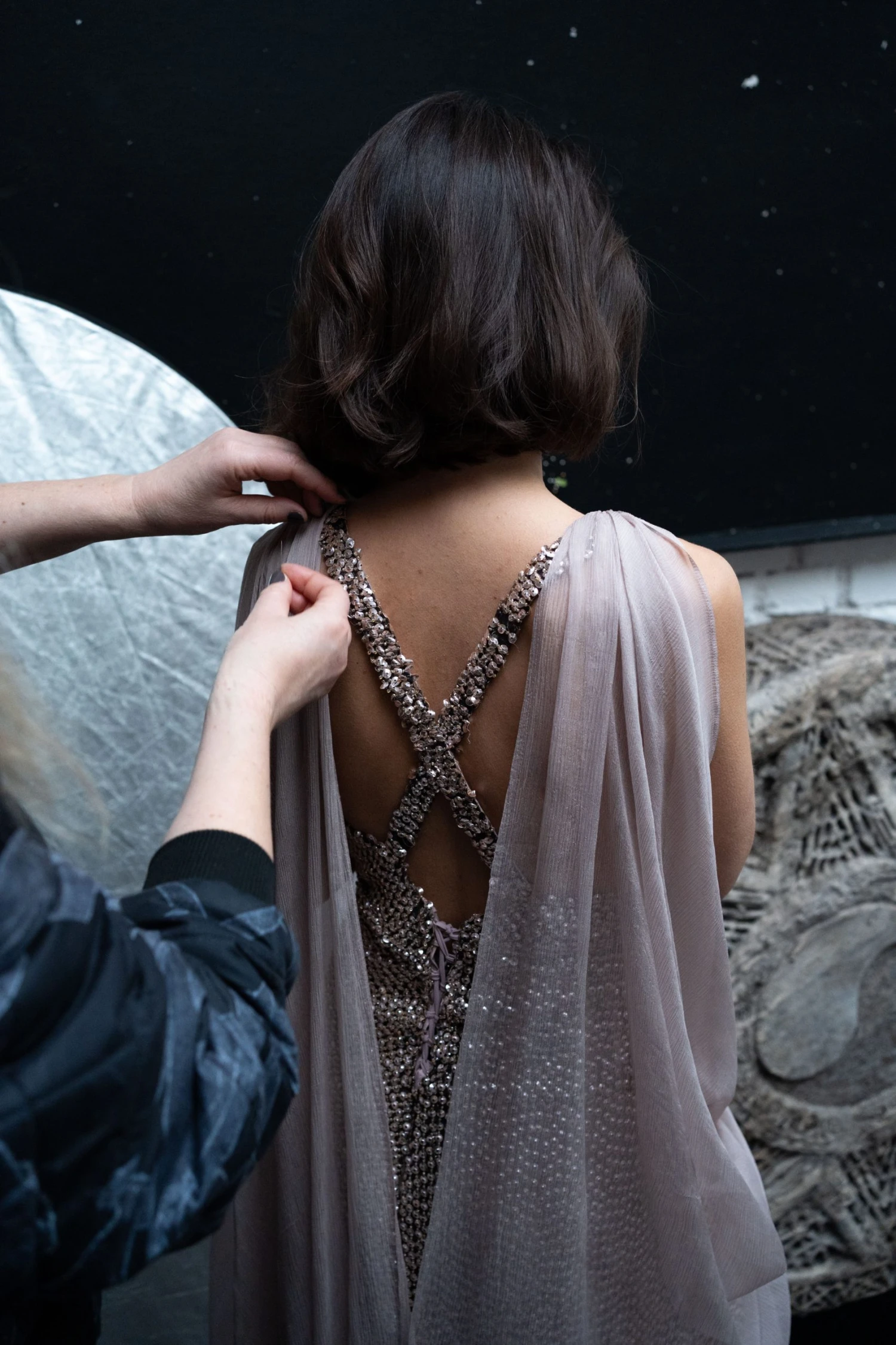 Druhý den začala hledat materiál. „Normálně jezdím pro látky do zahraničí, ale nakonec jsem i tady našla přesně to, co jsem potřebovala – vyšívaný tyl s malými flitry zakončenými korálkem a kvalitní hedvábí.“