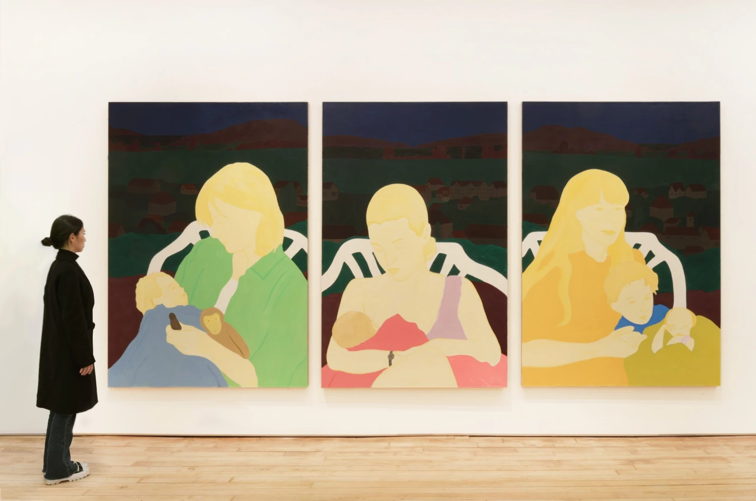 Má na sobě bílý svetr s šedými pruhy a velkou, výraznou růžovou péřovou bundu. Do obličeje jí vidět není, na plátně o to více vynikají její rudé rukavice a do žluta zbarvený obličej malé dívenky, která jí stojí po boku. Nevíme, kam spolu jdou ani co je čeká, i přesto s jistou mírou nadsázky můžeme prohlásit, že jde o výjev ryze univerzální.