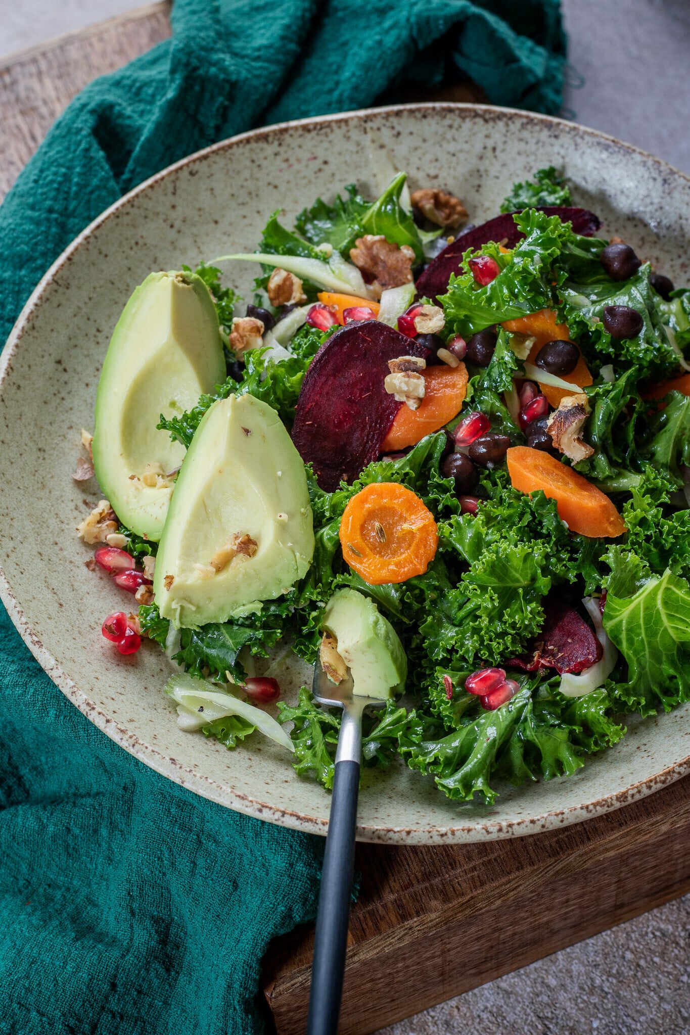 Mrkev i řepa během pečení posílí svou přirozeně sladkou chuť, takže dobře vyváží zemitost kadeřávku. Pomyslná třešinka na dortu v podobě granátového jablka a ořechů neslouží jen jako estetický dodatek, ale hraje v sofistikované kombinaci chutí důležitou roli.