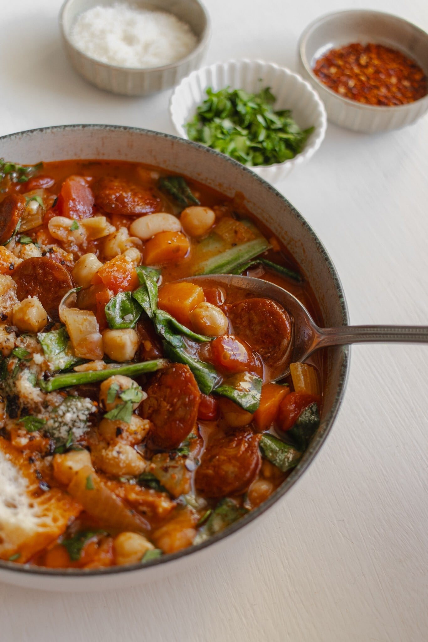 K téhle luštěninovo-zeleninové polévce mě inspirovala báječná Klára Michalová, která používá českou paprikovou klobásu, já dávám španělské chorizo a uzenou papriku, ale jídlo skvěle ovoní téměř jakákoli uzenina. A to ve množství, které je v kombinaci se spoustou zeleniny, cizrny a fazolí téměř zanedbatelné. Polévka má dostatek bílkovin, vlákniny, vitaminů a minerálů a v některých případech chutná i dětem (pro ty ovšem raději vynechte chilli).