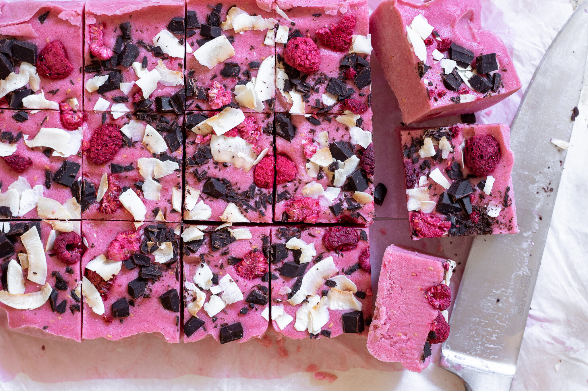 - Směs posypejte nadrobno nakrájenou čokoládou, malinami a kokosovými chipsy. Můžete použít i různé ořechy, ořechy nebo ovoce máčené v čokoládě, lyofilizované fíky nebo banány i další ovoce. Dejte zamrazit.